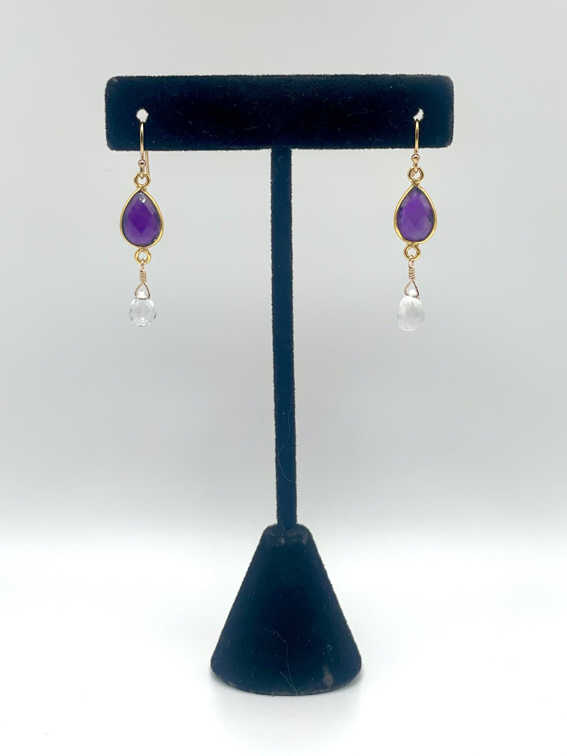 These classy amethyst teardrop earrings are a great way to add a classic feel to your every day outfit or a night out! Made with genuine amethyst stone in a vermeil setting (sterling silver plated gold), gold filled earring hook, and a genuine crystal quartz teardrop stone wrapped with gold filled wire. Hand made to create a clean look!
