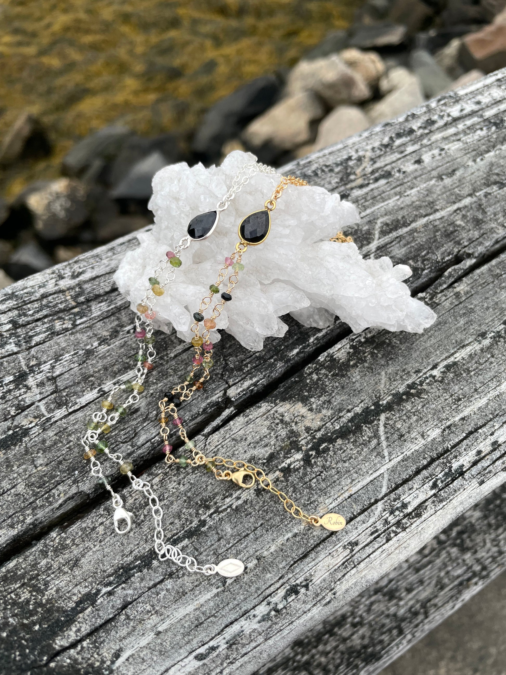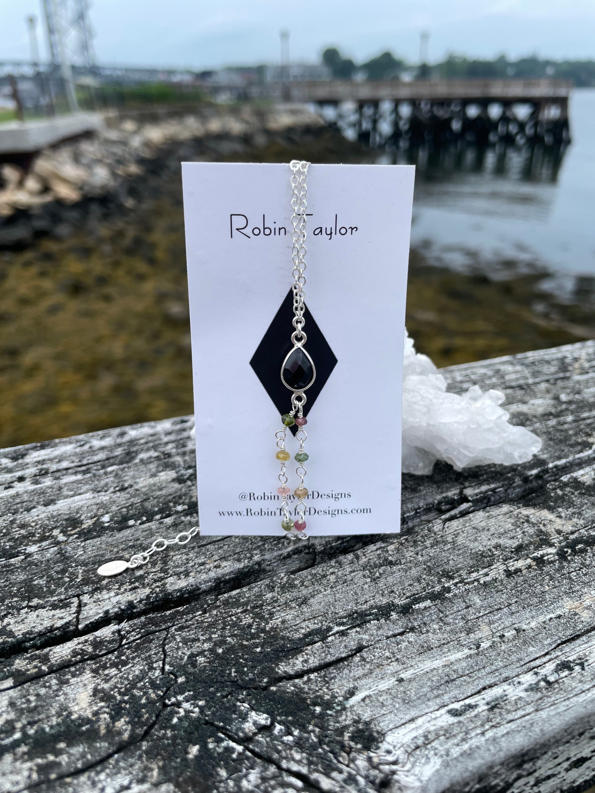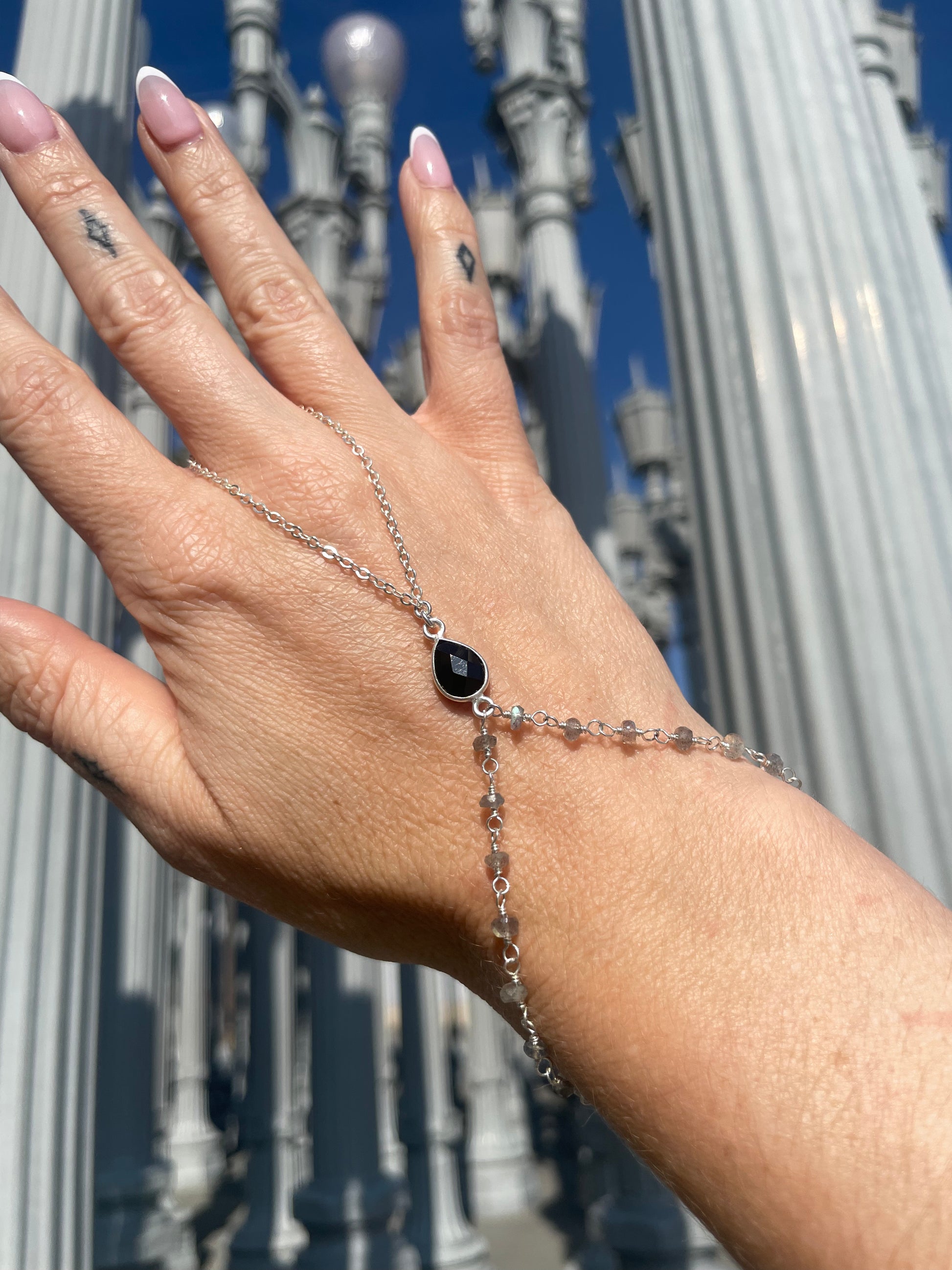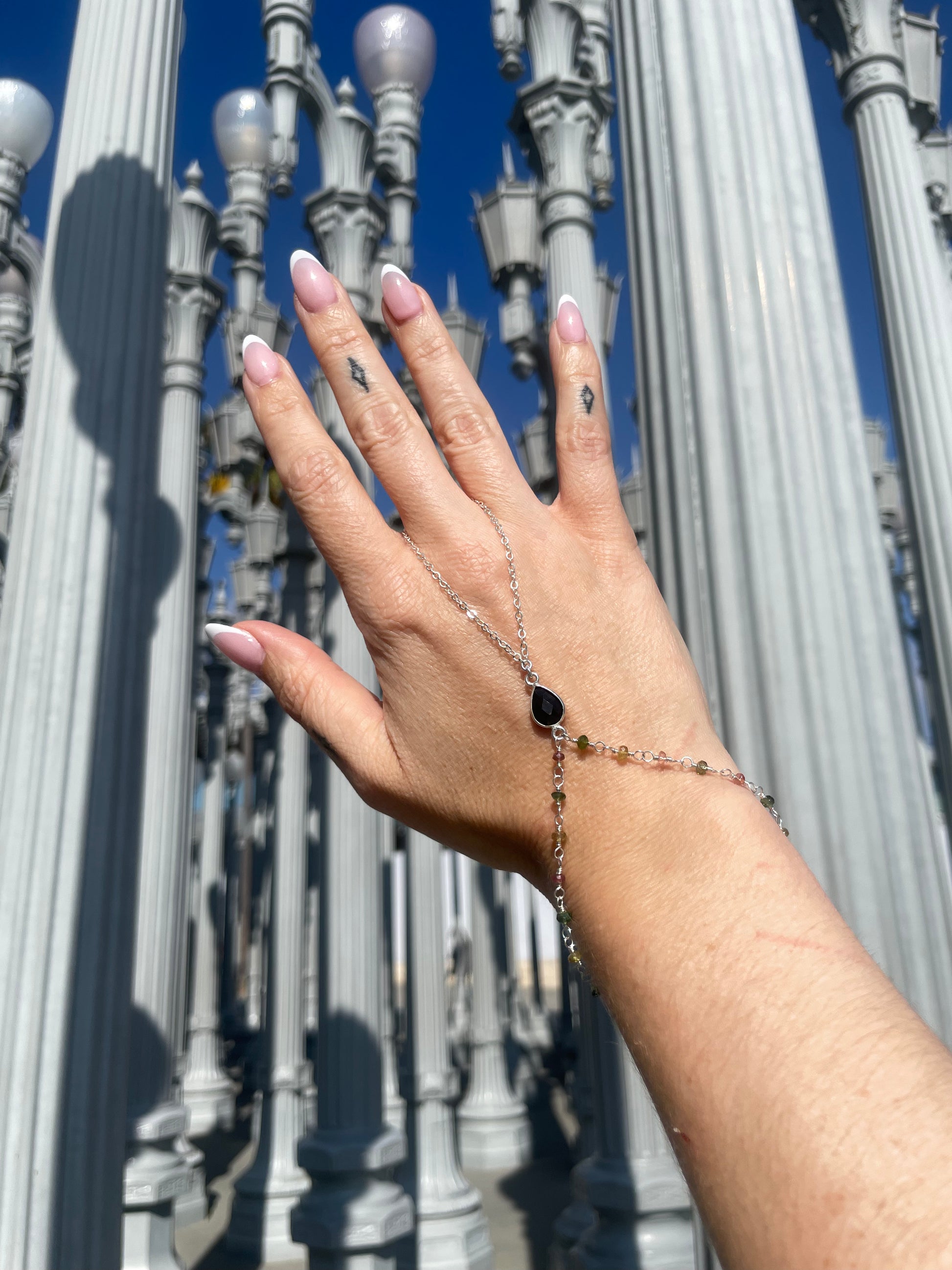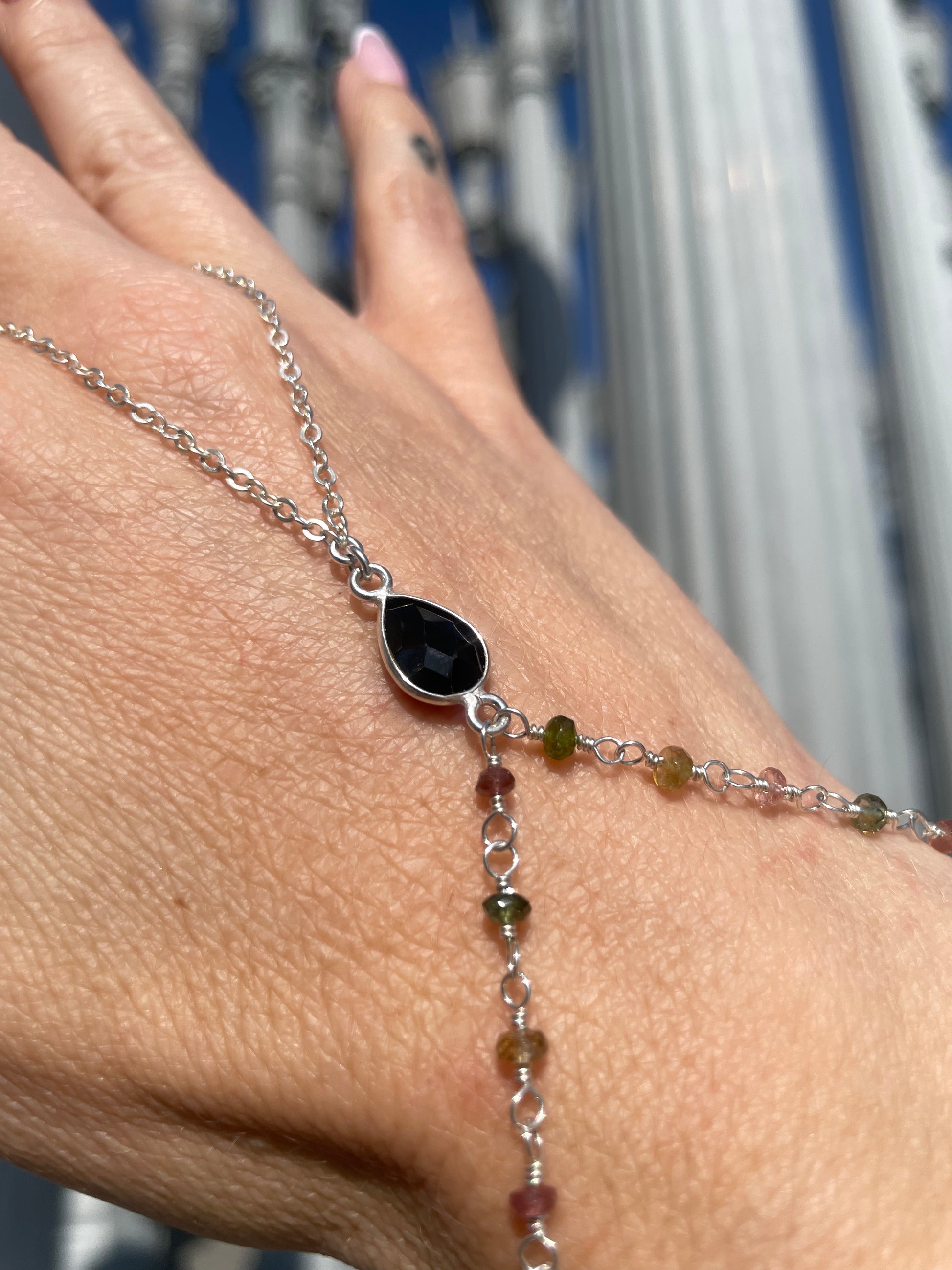 Black Spinel w/ Wrapped Tourmaline Silver Hand Chain