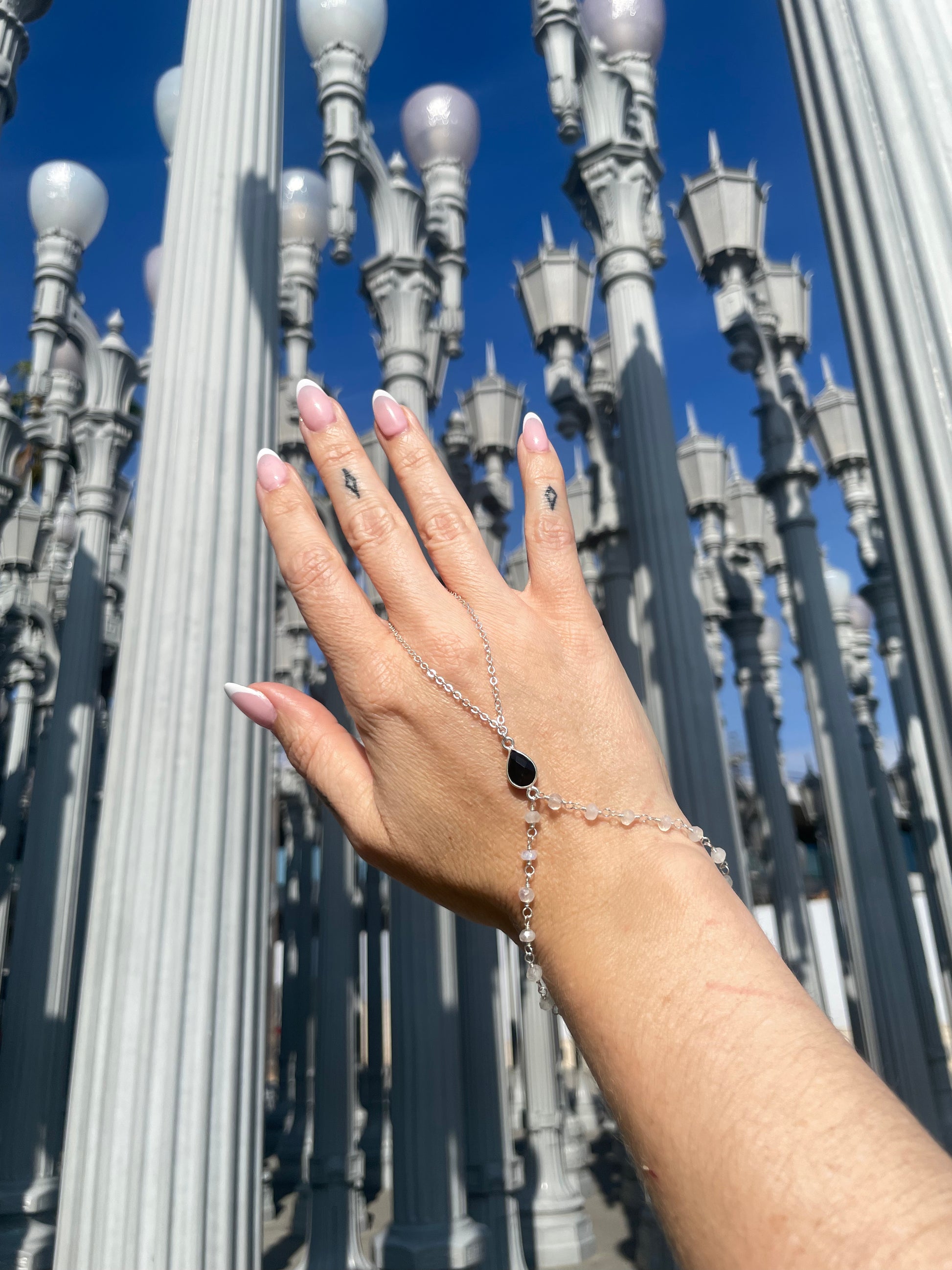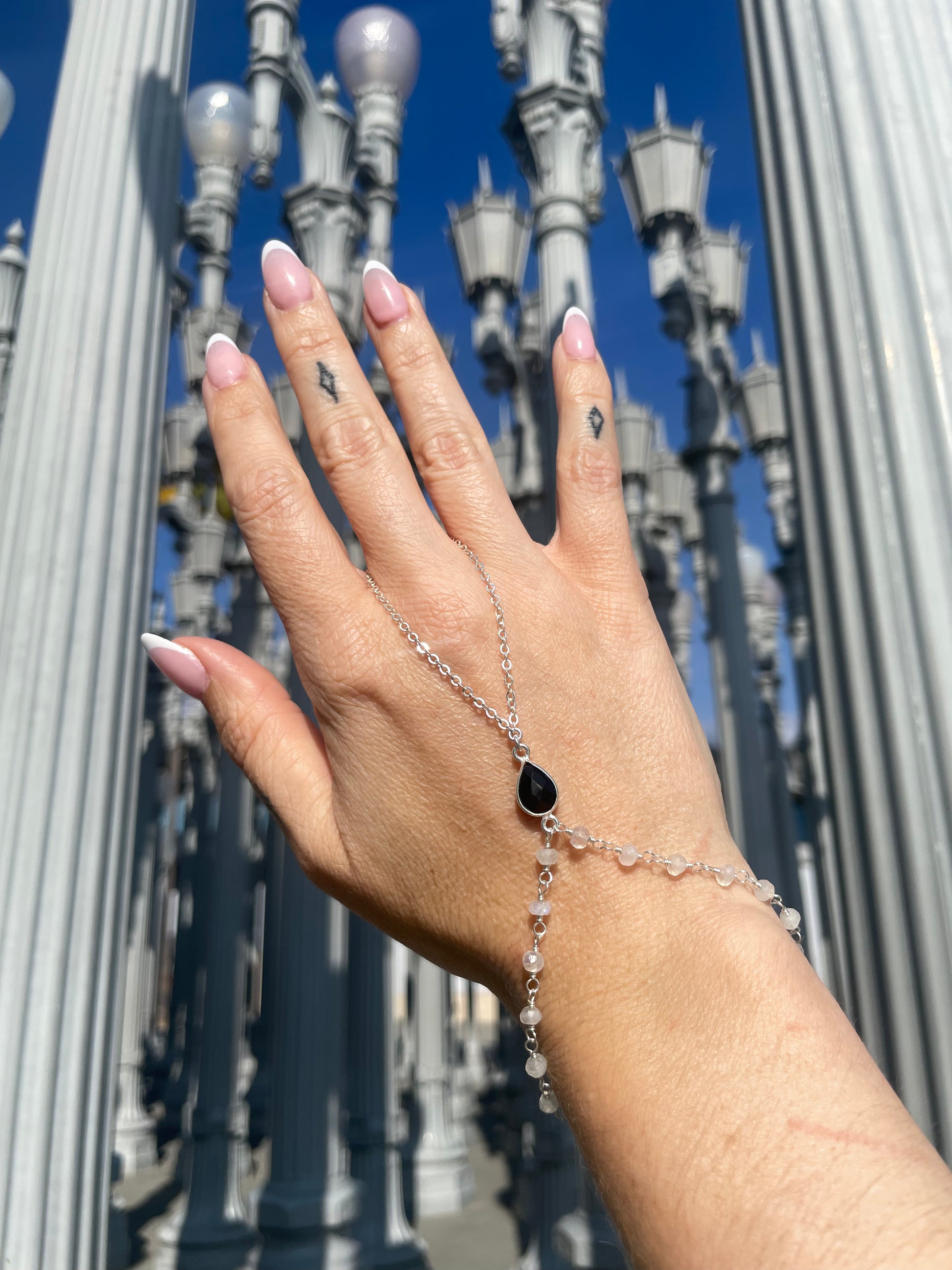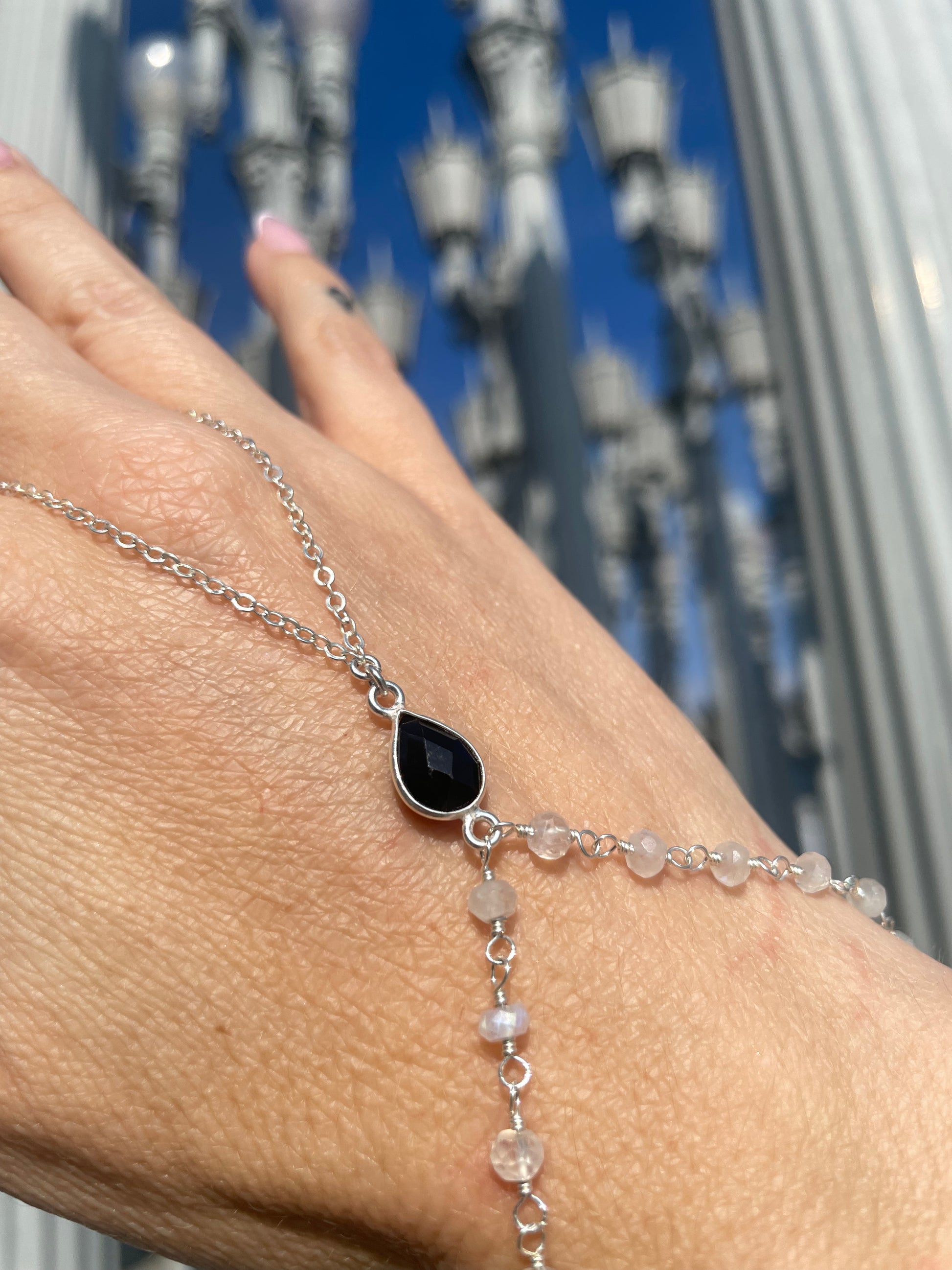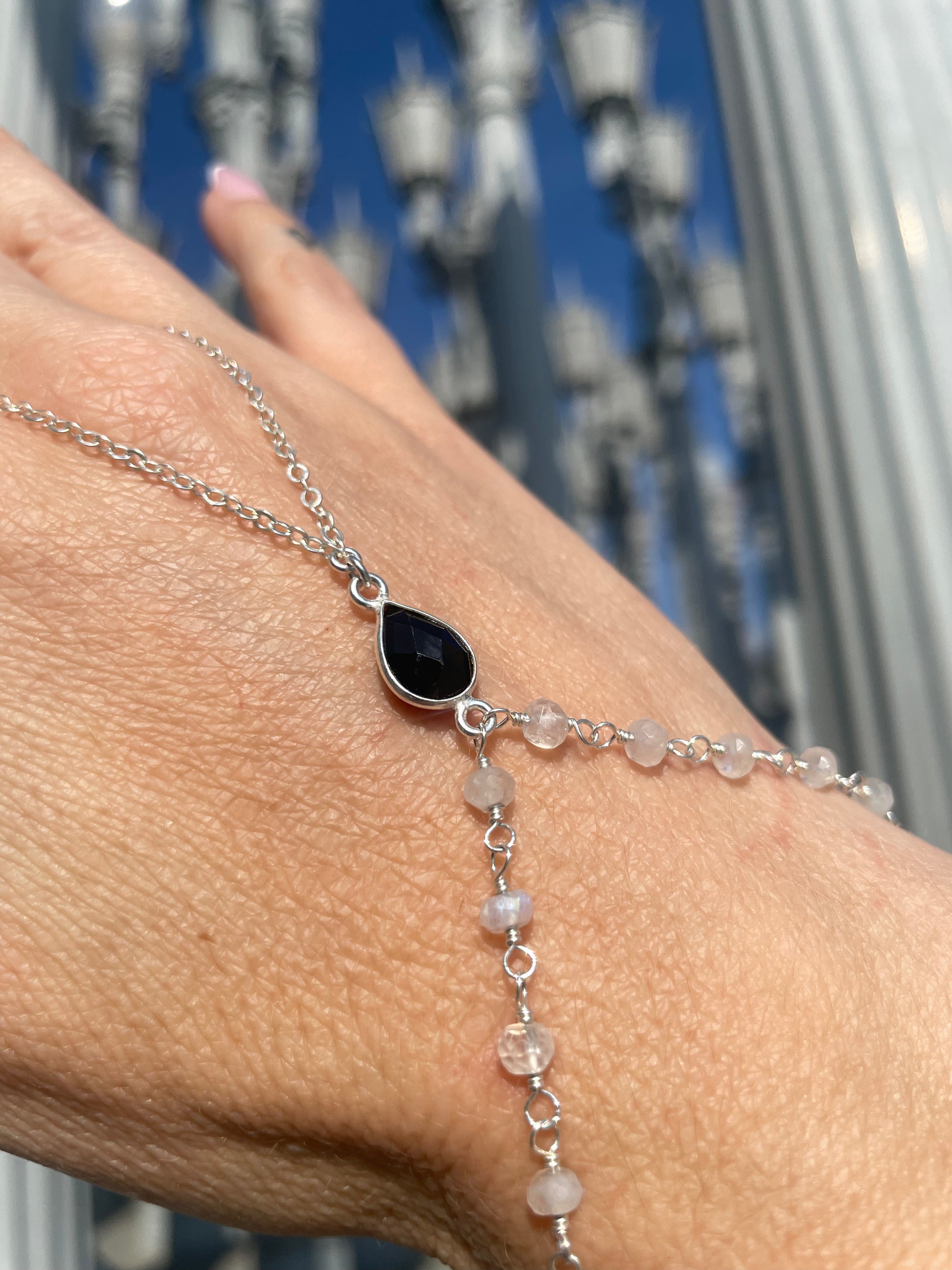 Black Spinel w/ Wrapped Moonstone Silver Hand Chain