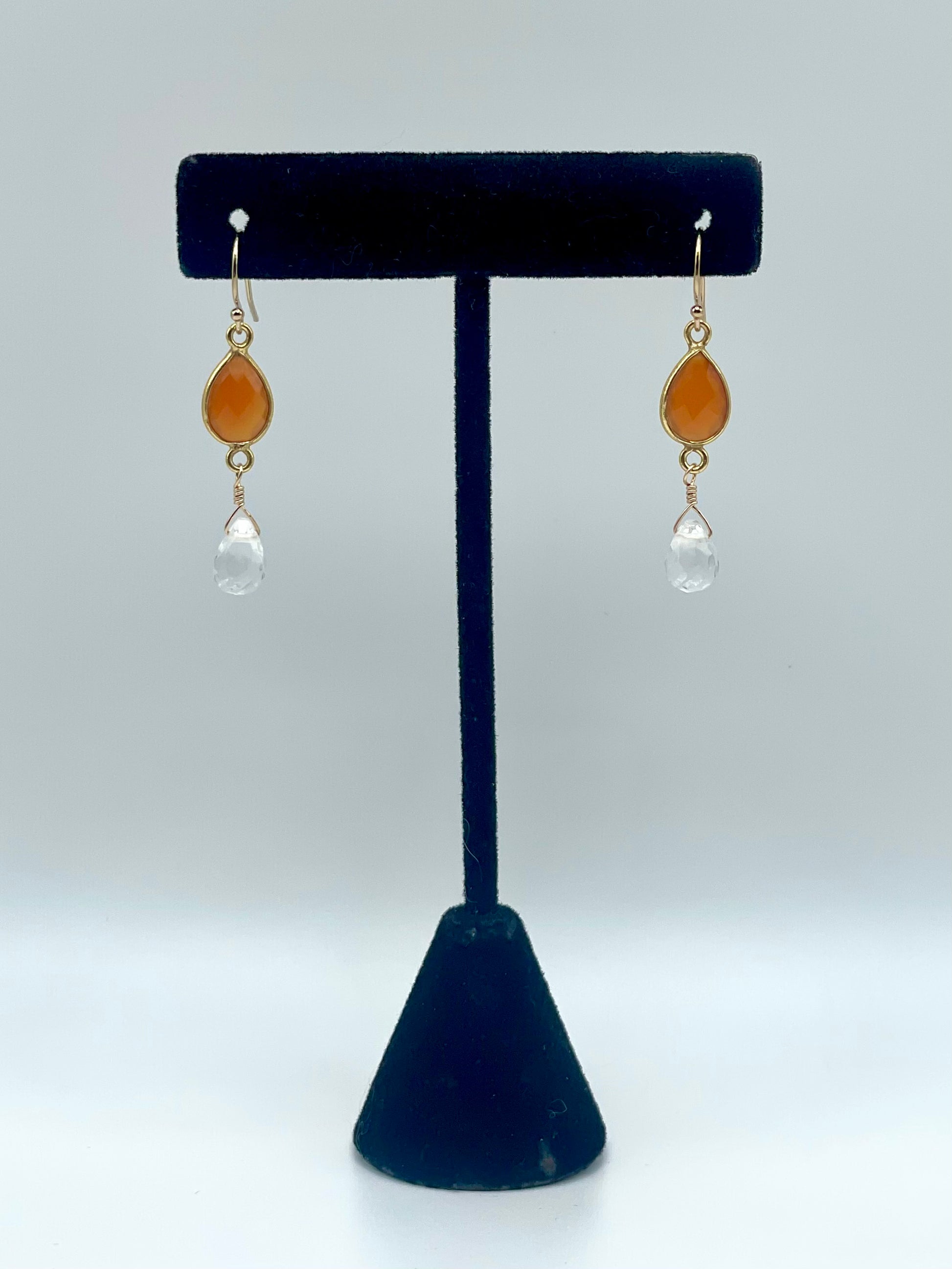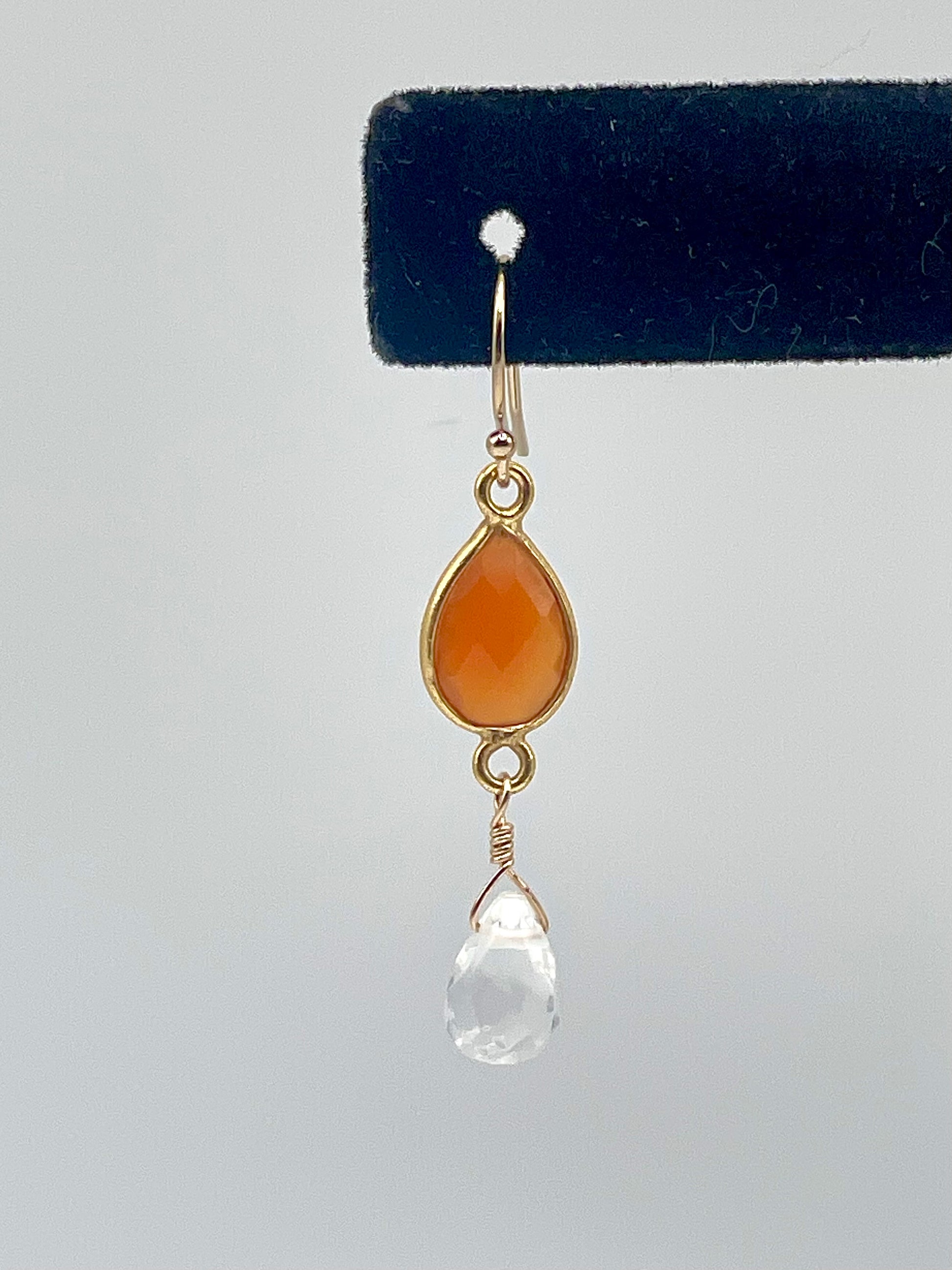 These classy carnelian teardrop earrings are a great way to add a classic feel to your every day outfit or a night out! Made with genuine carnelian stone in a vermeil setting (sterling silver plated gold), gold filled earring hook, and a genuine crystal quartz teardrop stone wrapped with gold filled wire. Hand made to create a clean look!