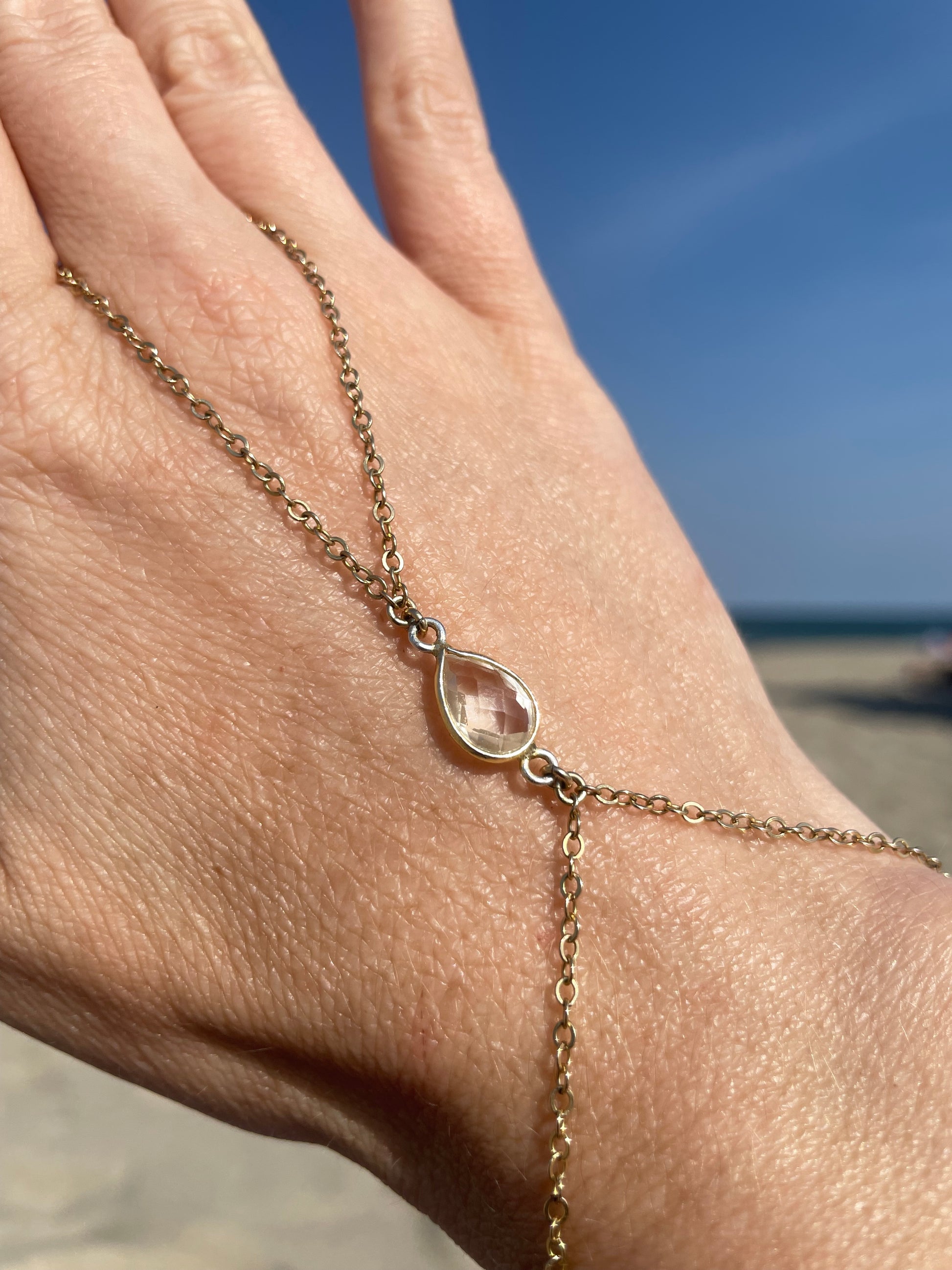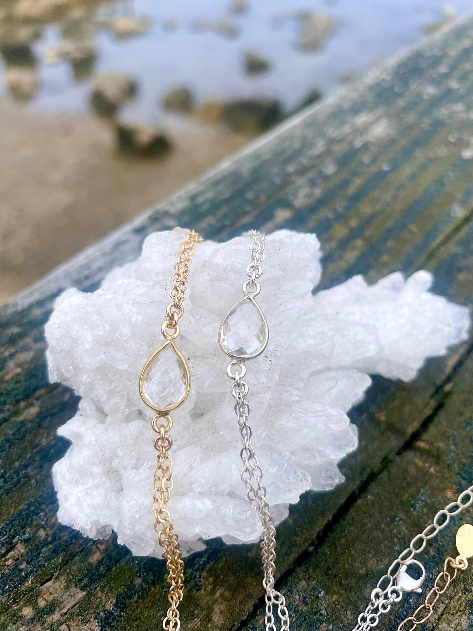 Crystal Quartz faceted teardrop gemstone in a vermeil setting with gold filled chain and findings, finished with an engraved jewelry tag. Perfect for a classy touch to your every day life or a special occasion!