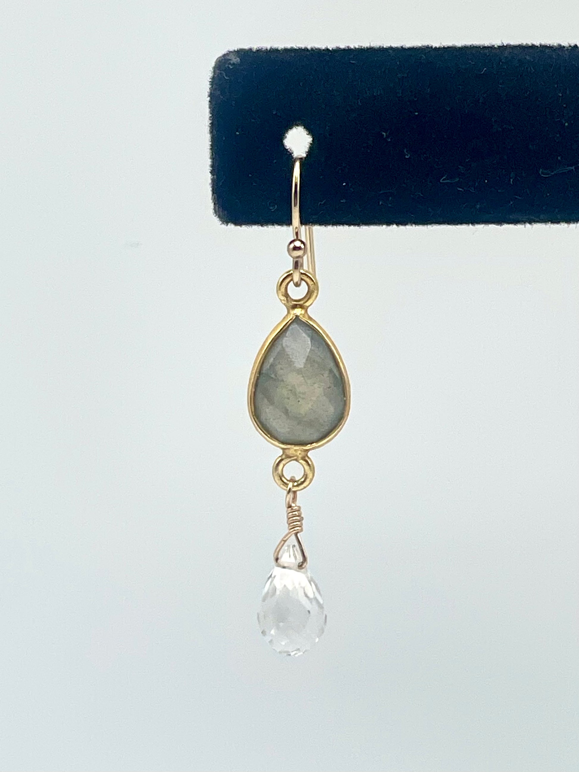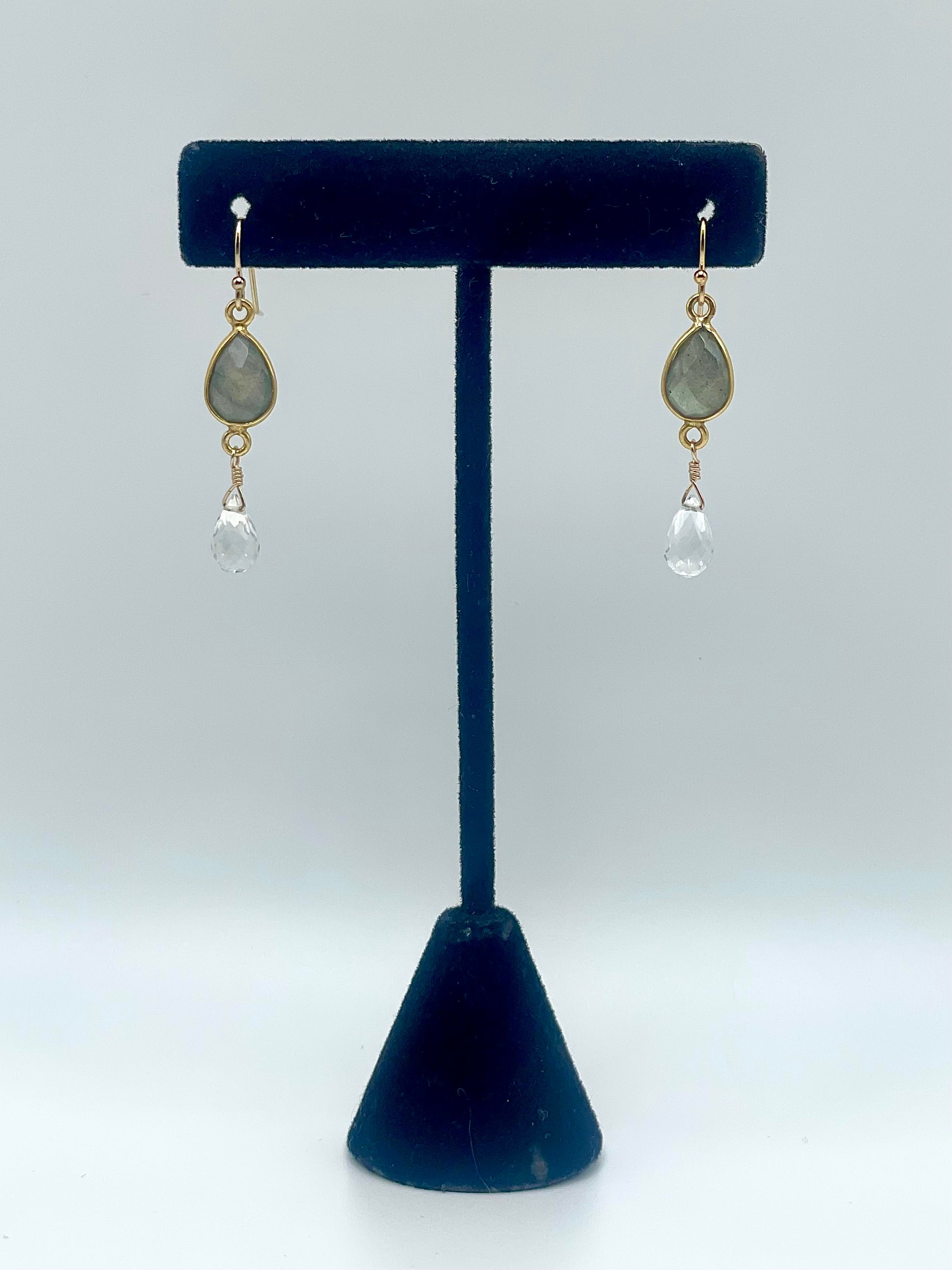 These classy labradorite teardrop earrings are a great way to add a classic feel to your every day outfit or a night out! Made with genuine labradorite stone in a vermeil setting (sterling silver plated gold), gold-filled earring hook, and a genuine crystal quartz teardrop stone wrapped with gold-filled wire. Hand made to create a clean look!