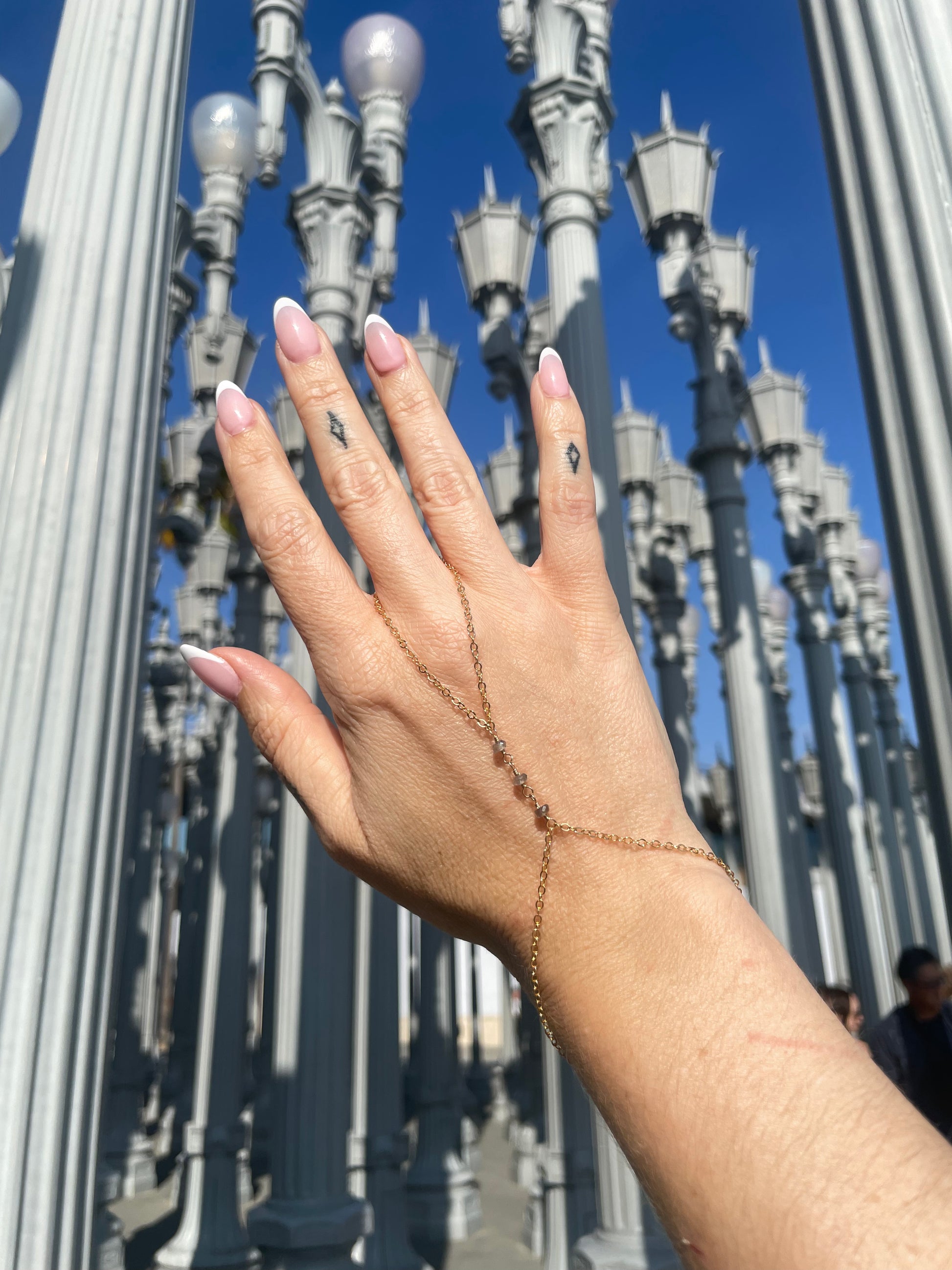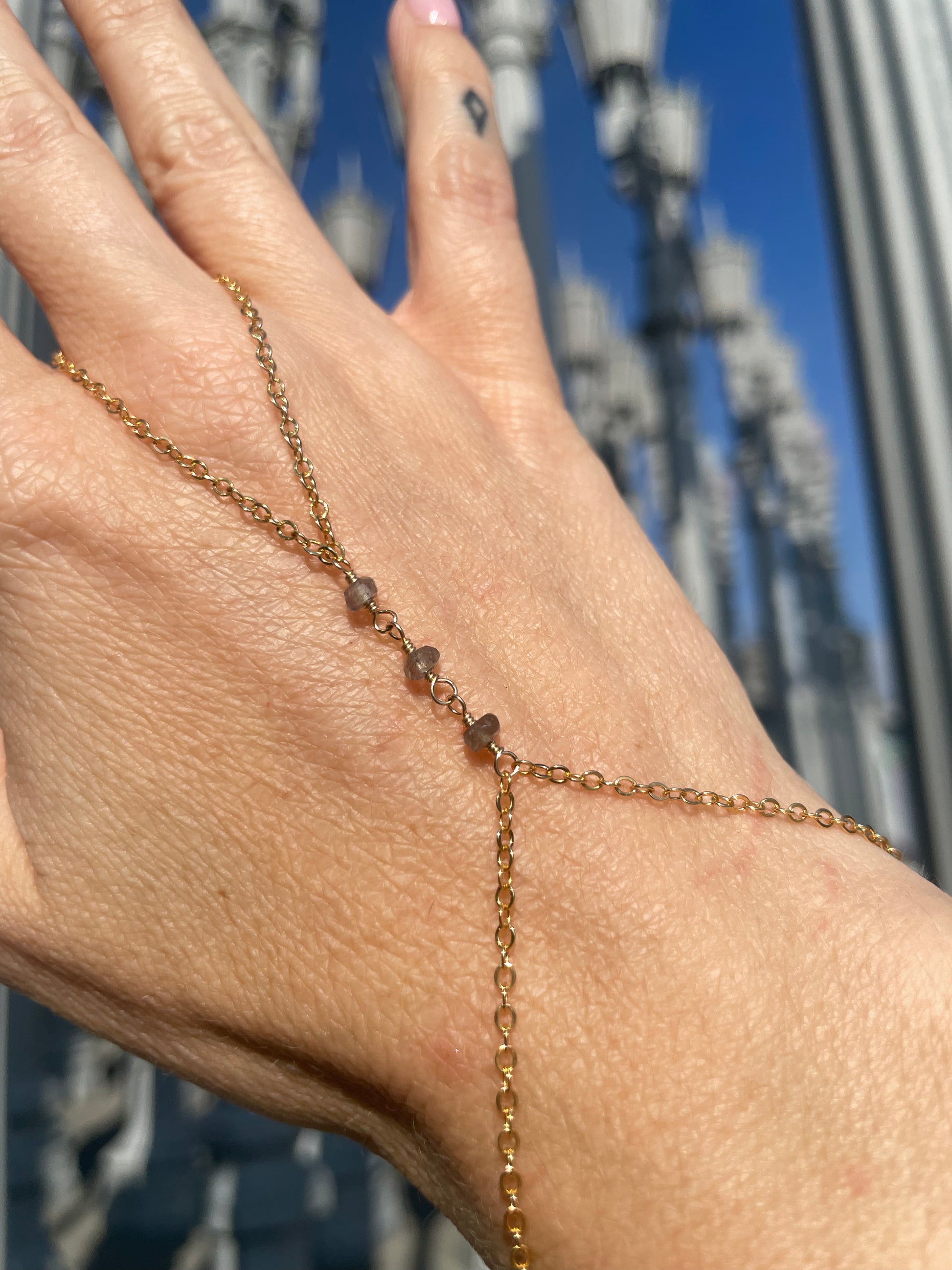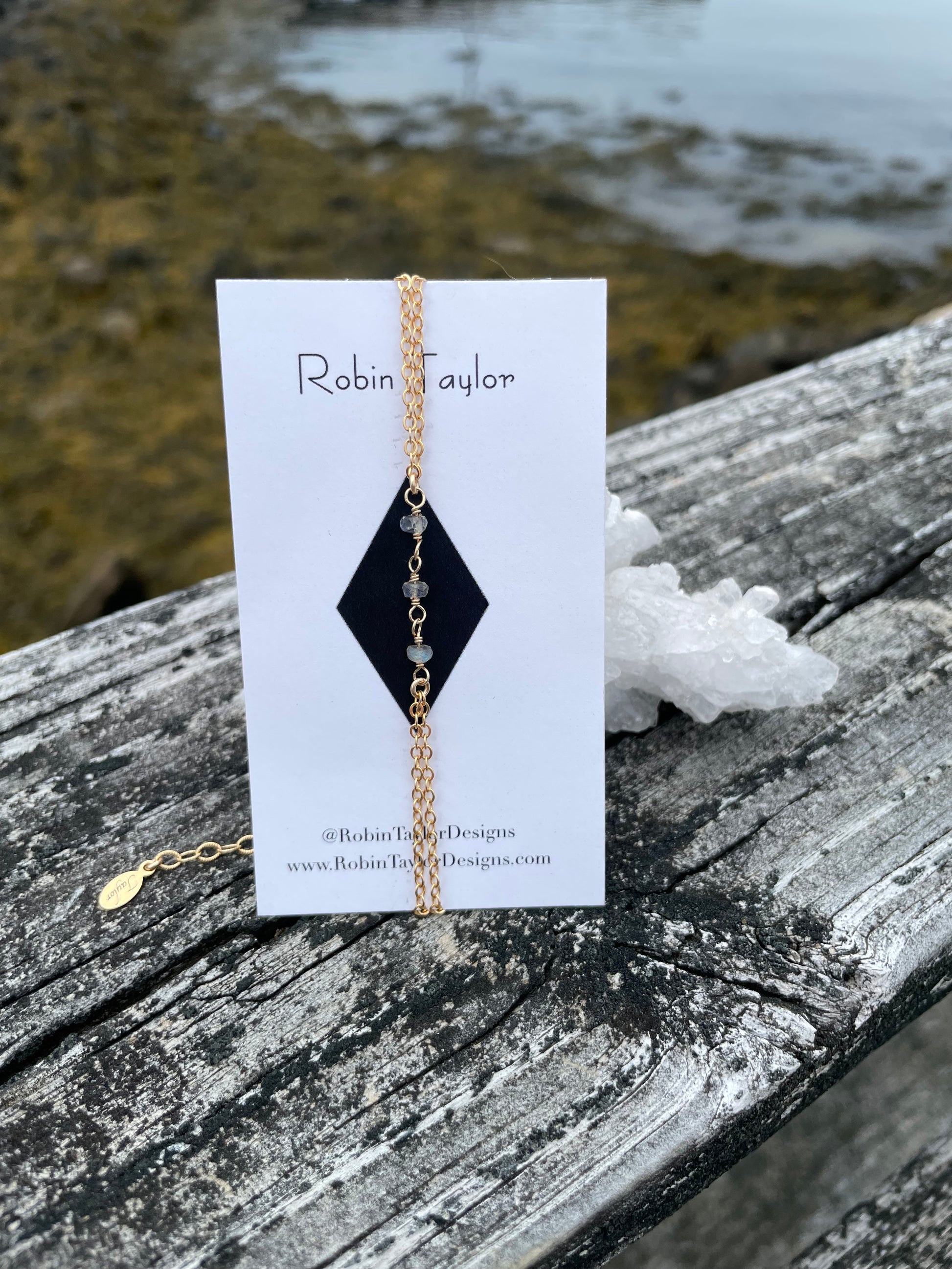 Three 4mm labradorite faceted stones hand wire wrapped with gold-filled wire and finished with gold-filled chain & findings. The labradorite adds a mystical feel while the gold adds a royal feel and finish.