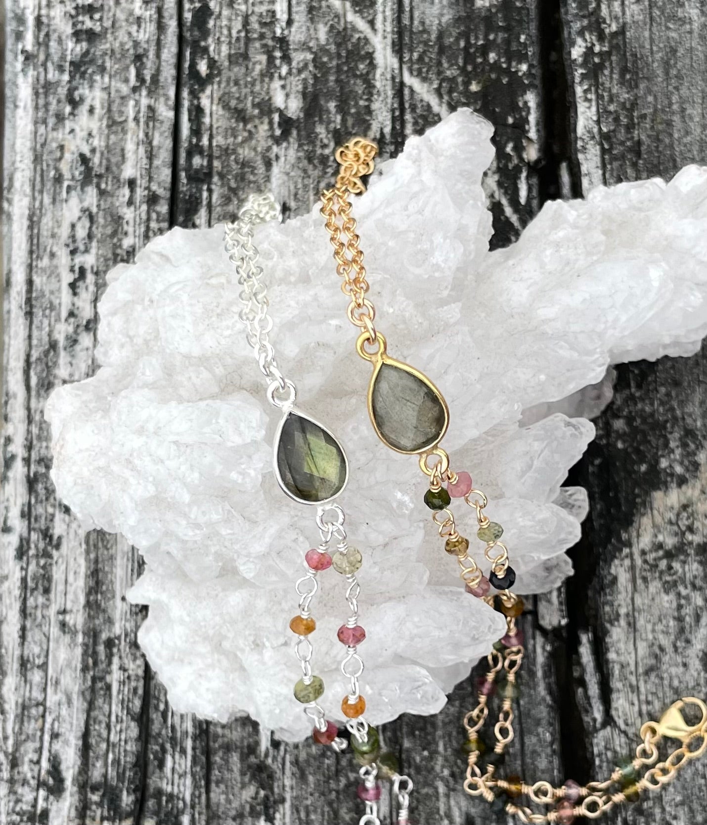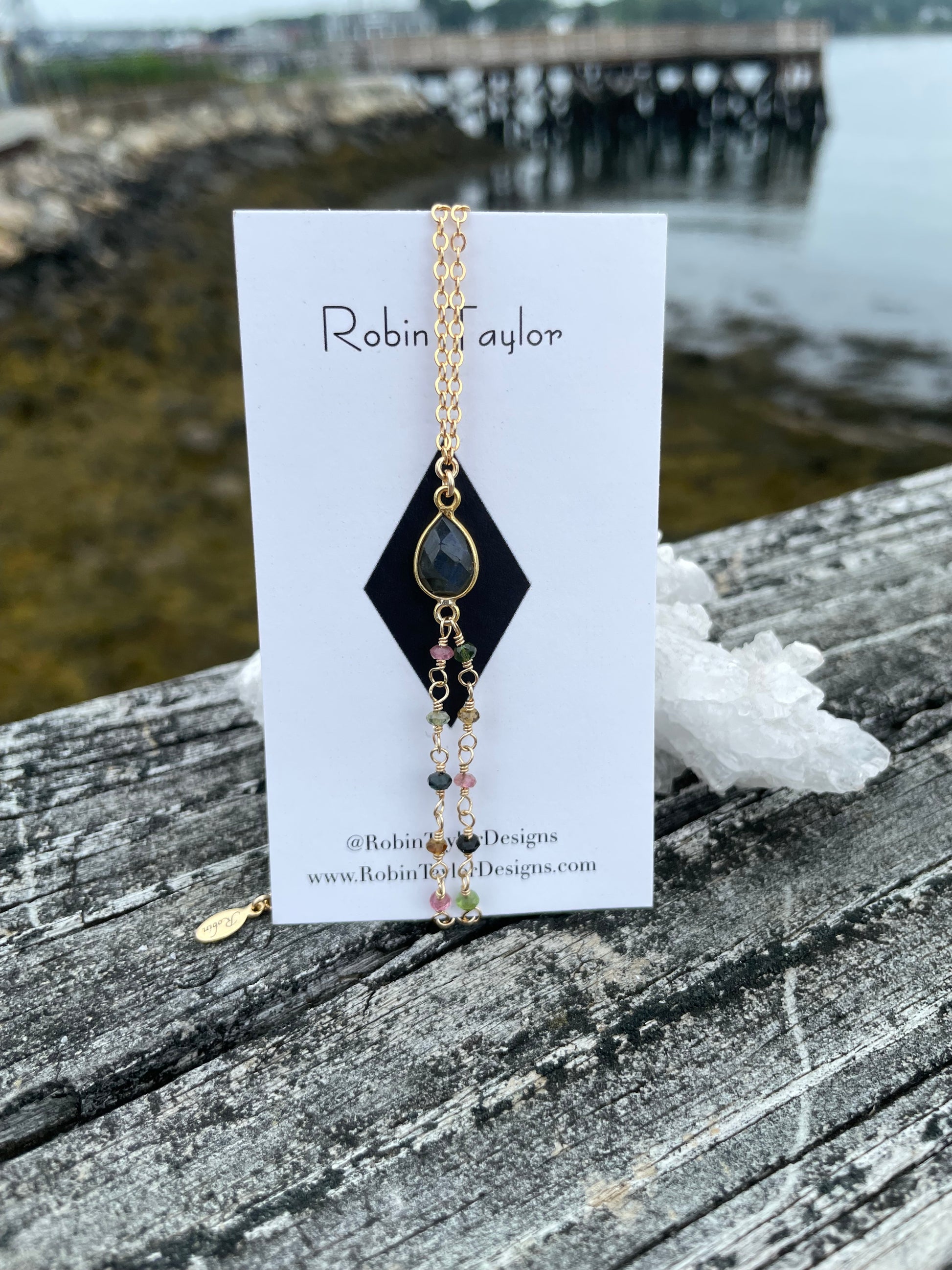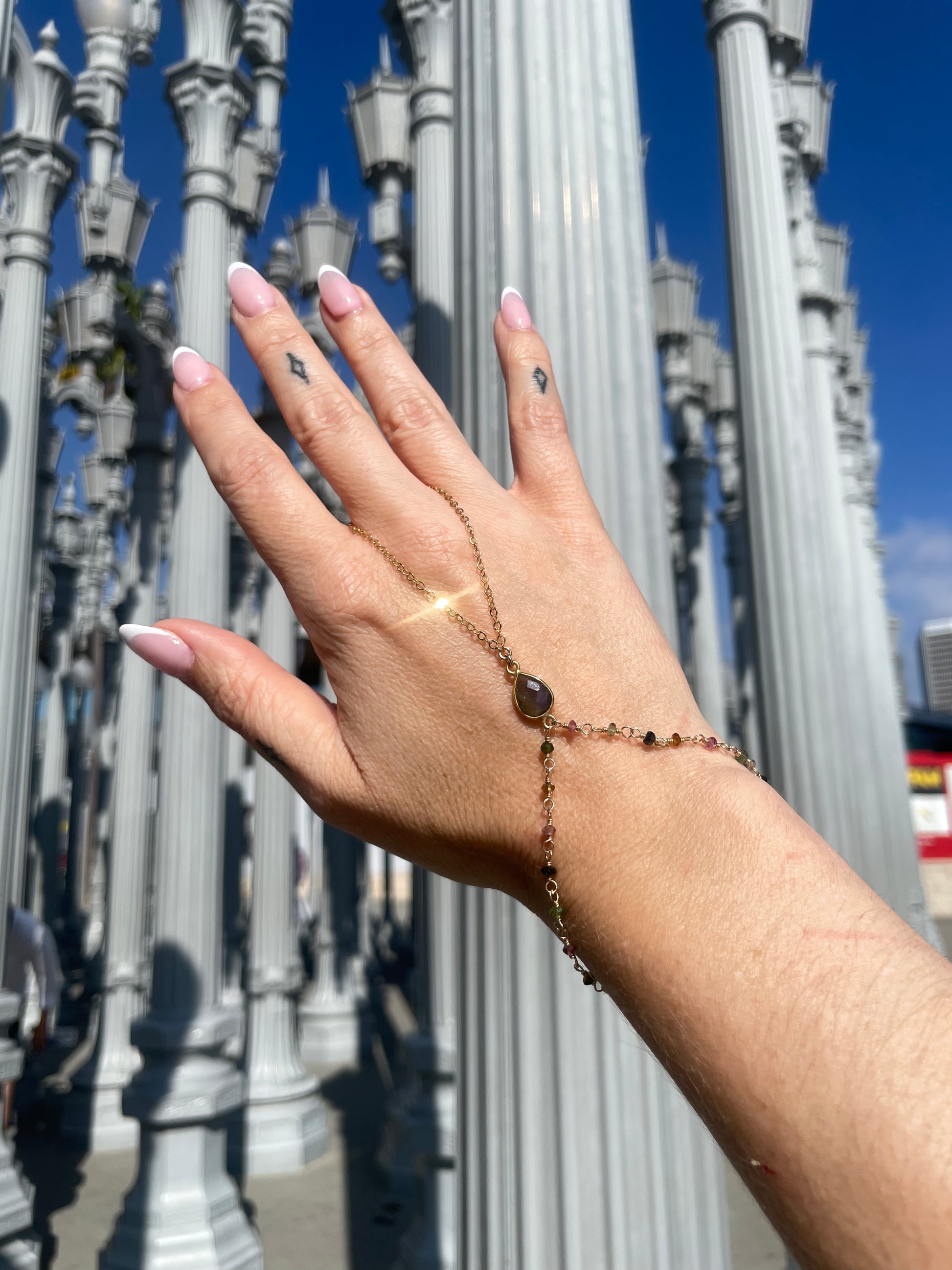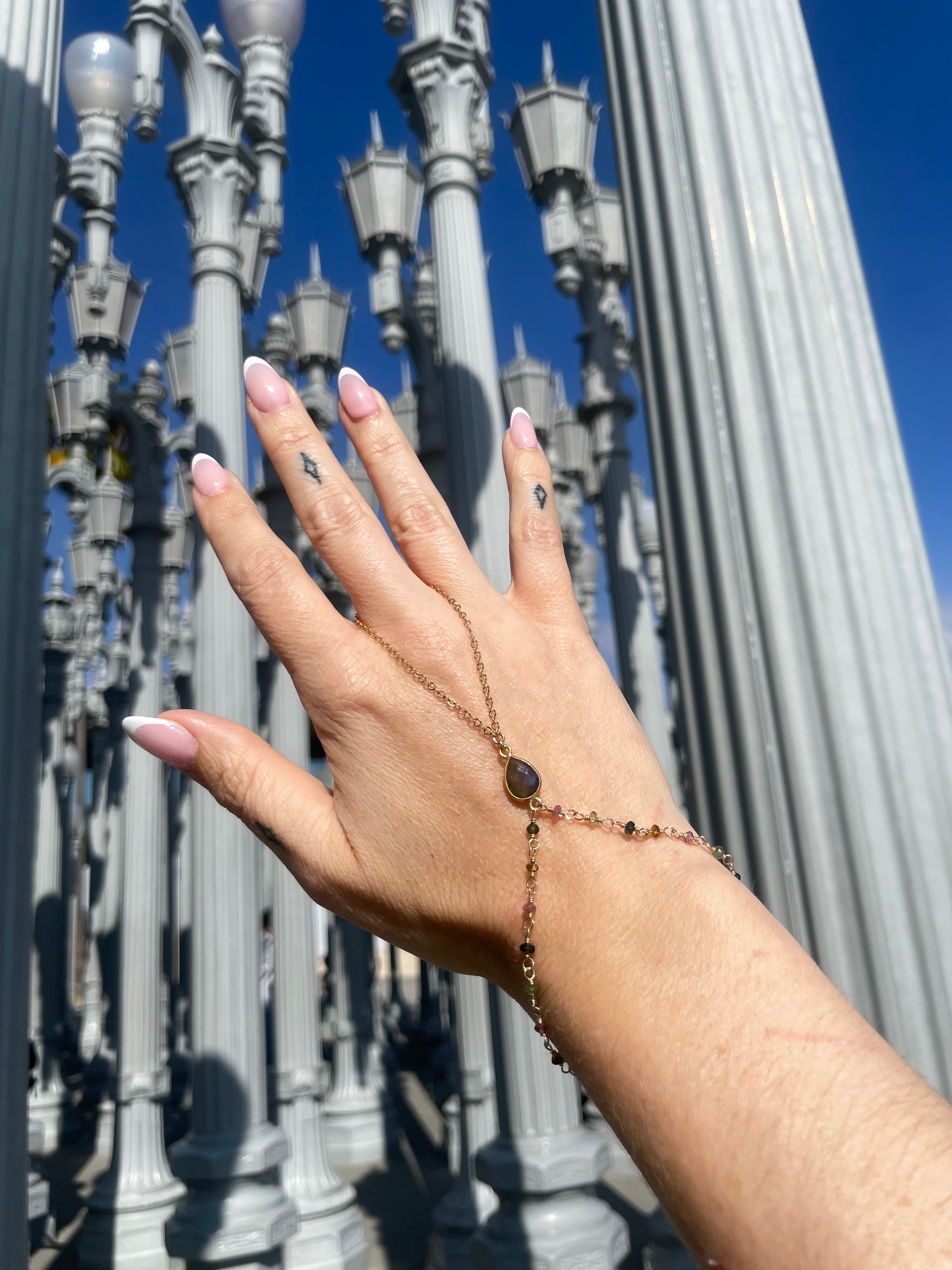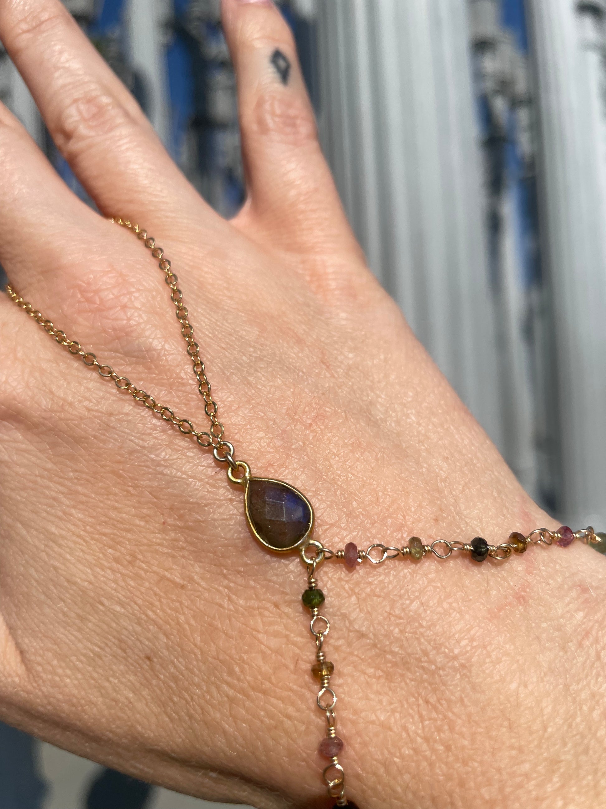 Labradorite w/ Wrapped Tourmaline Gold Hand Chain