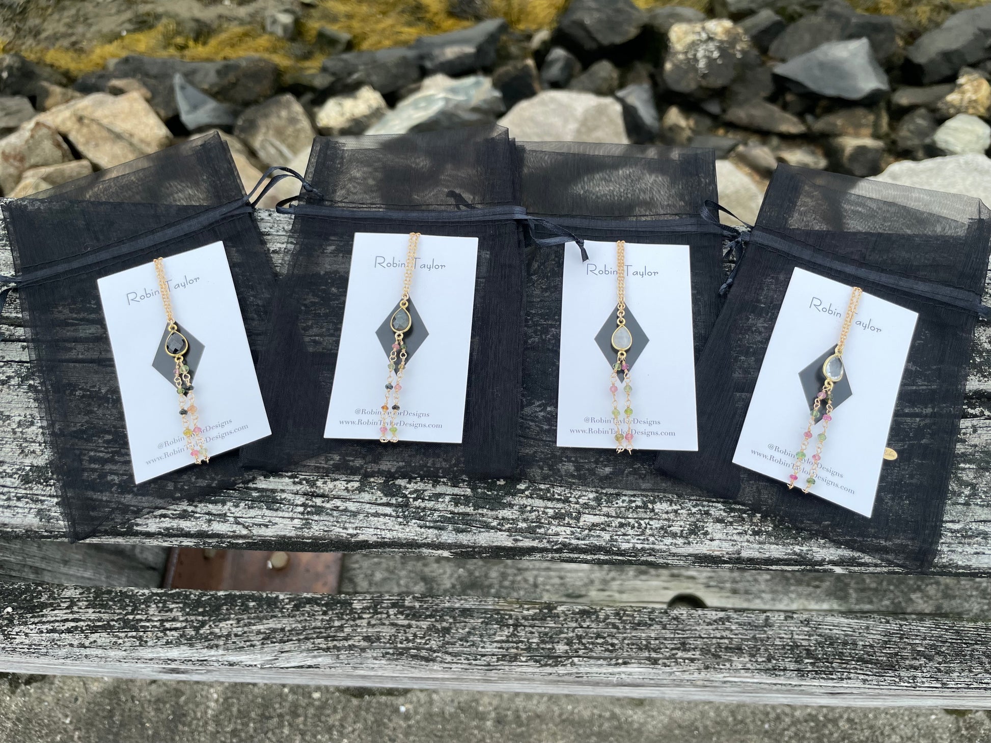Labradorite teardrop sits center stage to this beautifully hand wrapped gold hand chain with 4mm watermelon tourmaline gems. Hand wire wrapped with gold-filled wire and finished with gold-filled chain & findings. Labradorite and gold create a bold look while the watermelon tourmaline adds a pop of color.