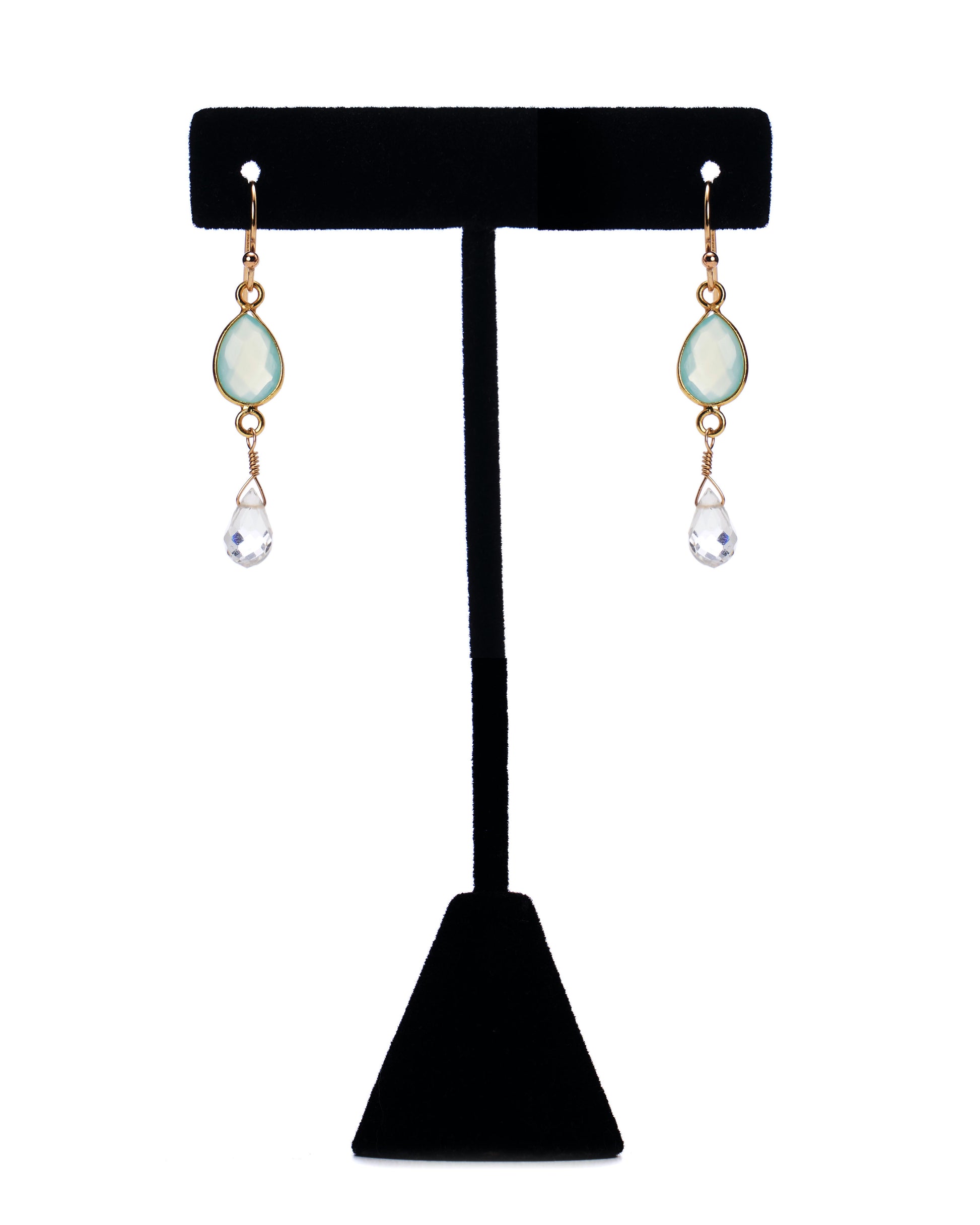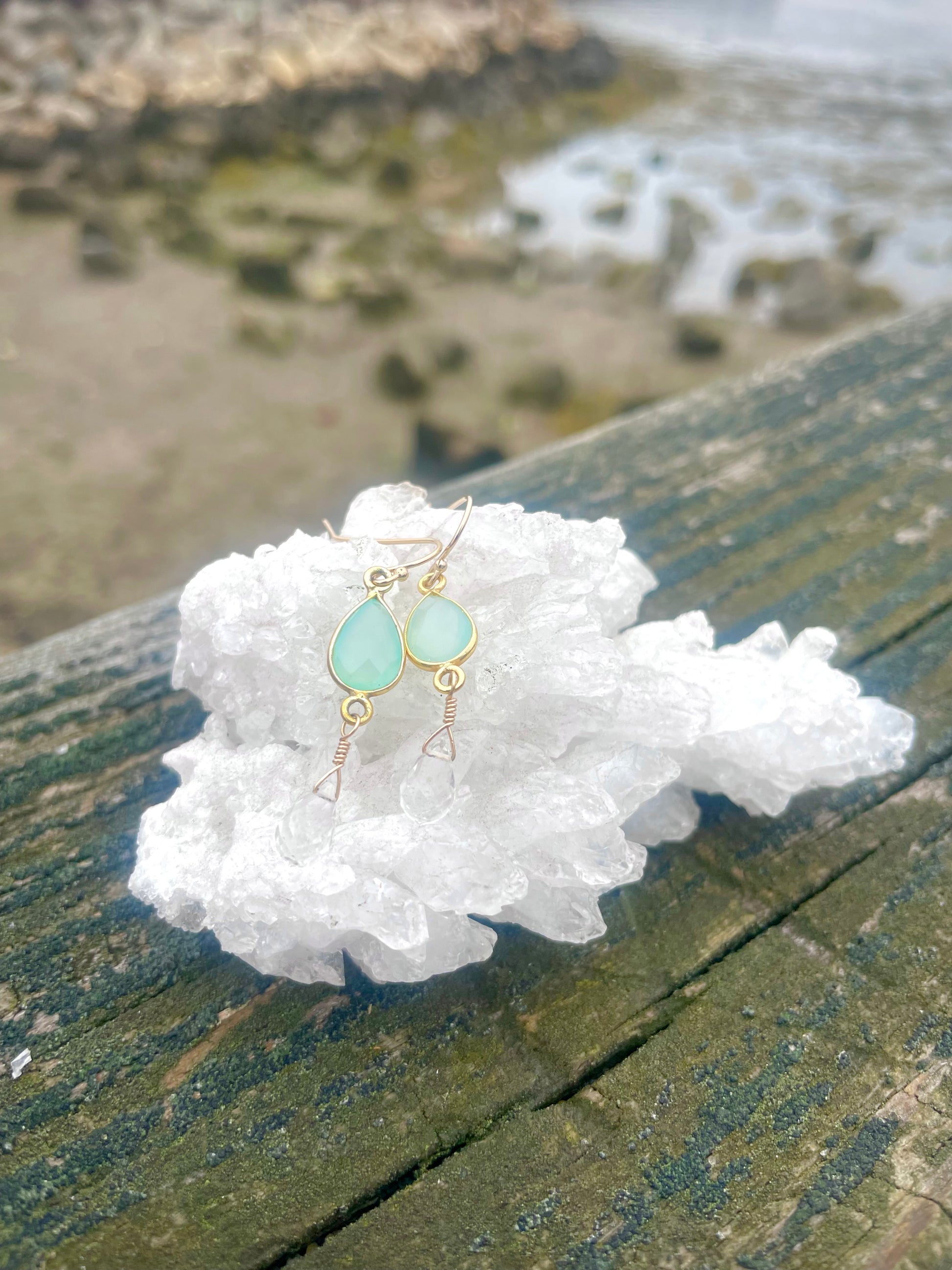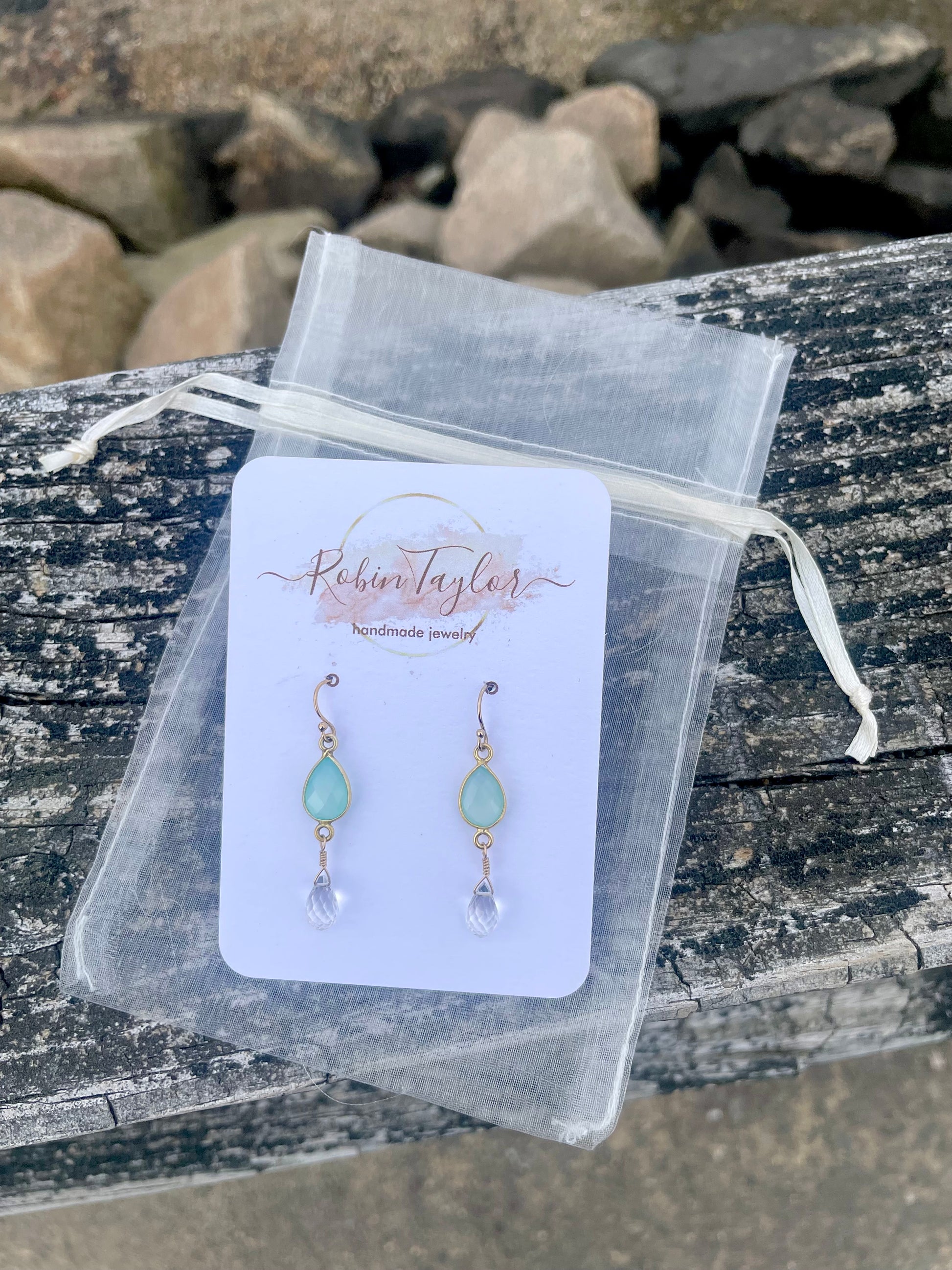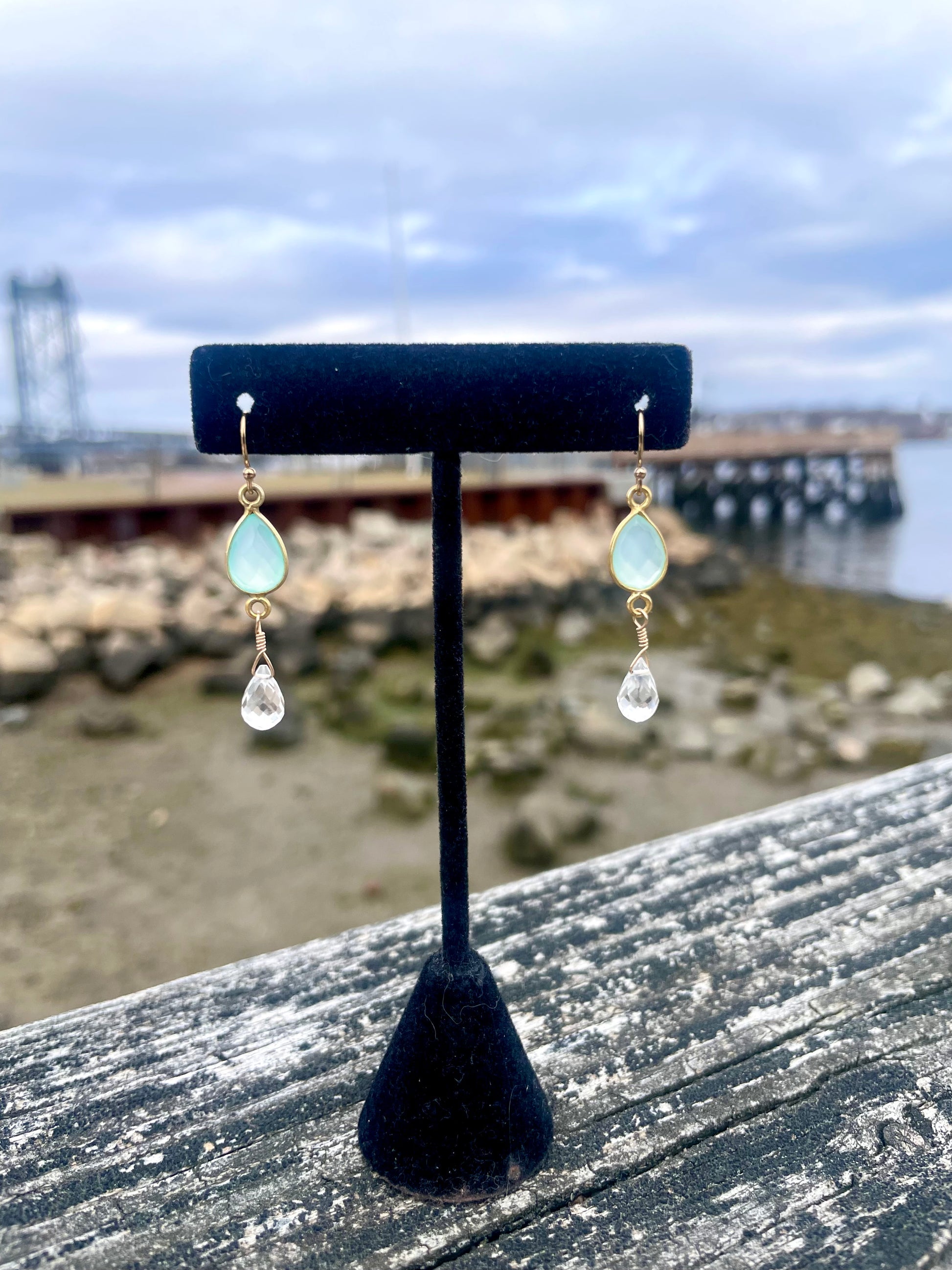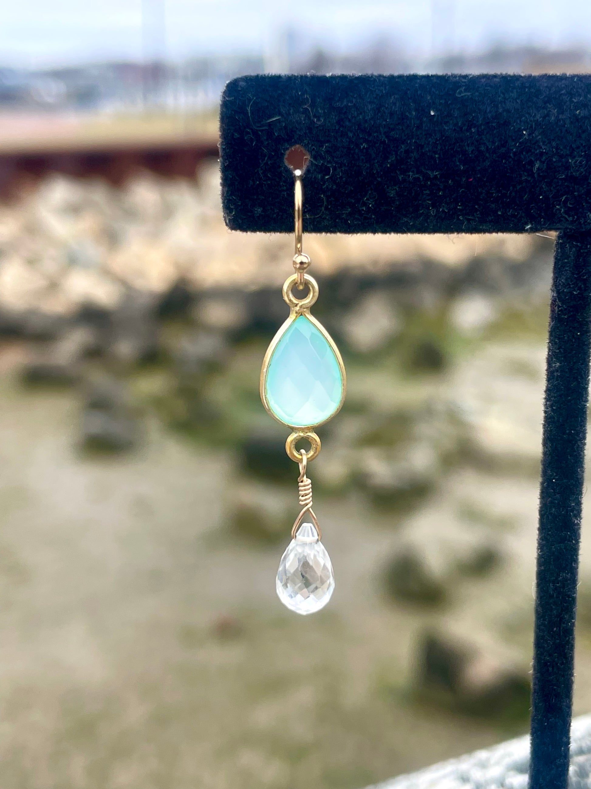 Seablue chalcedony teardrop stone sits beautifully in a vermeil teardrop setting, finished with a faceted crystal quartz teardrop stone. Hand wire wrapped with gold-filled wire for a high-end, classy look and strong hold. Made with gold-filled ear wires.