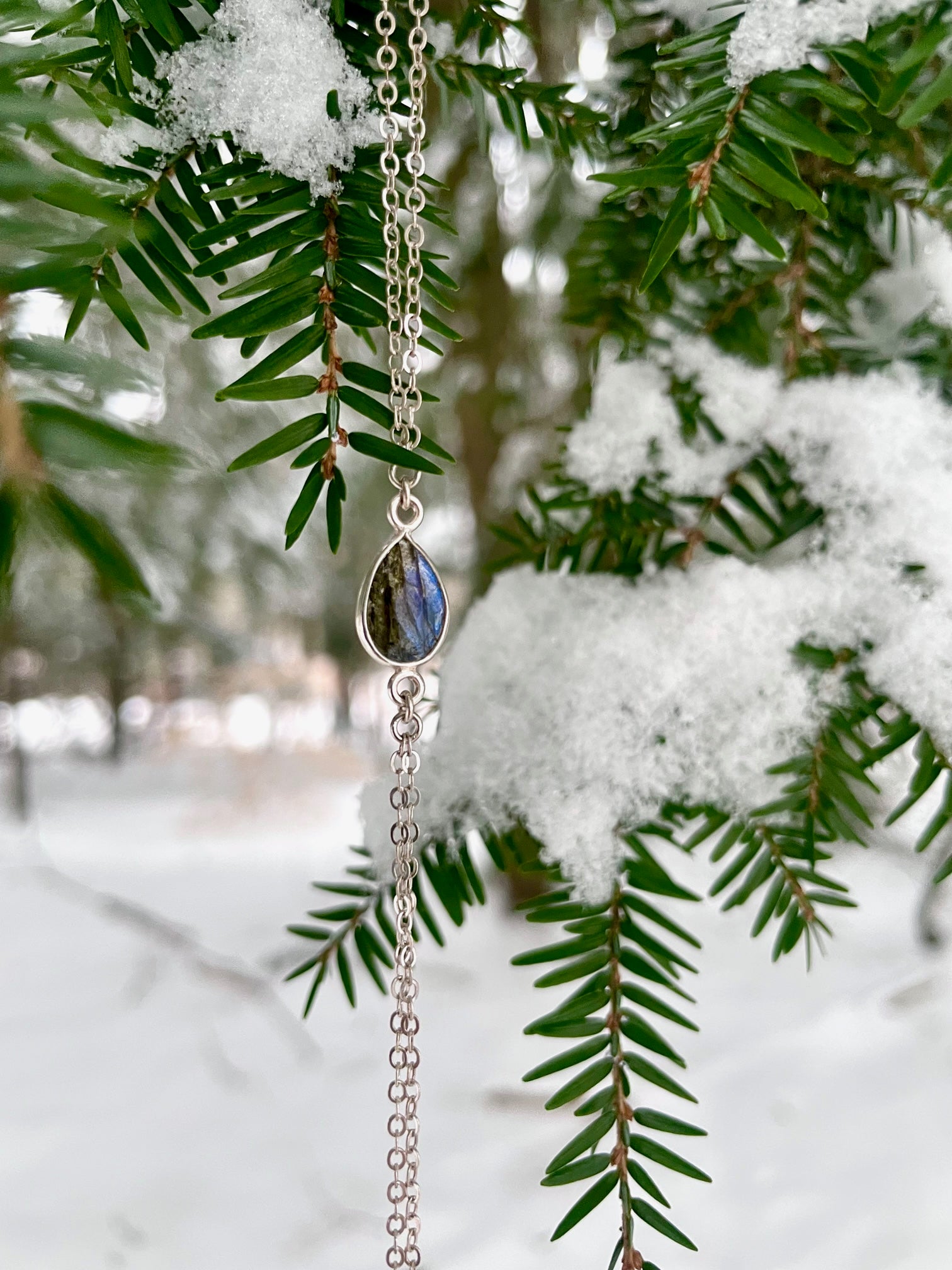 Labradorite faceted teardrop gemstone in a sterling silver setting, sterling silver chain and findings, finished with an engraved jewelry tag. Perfect for a classy touch to your every day life or a special occasion!