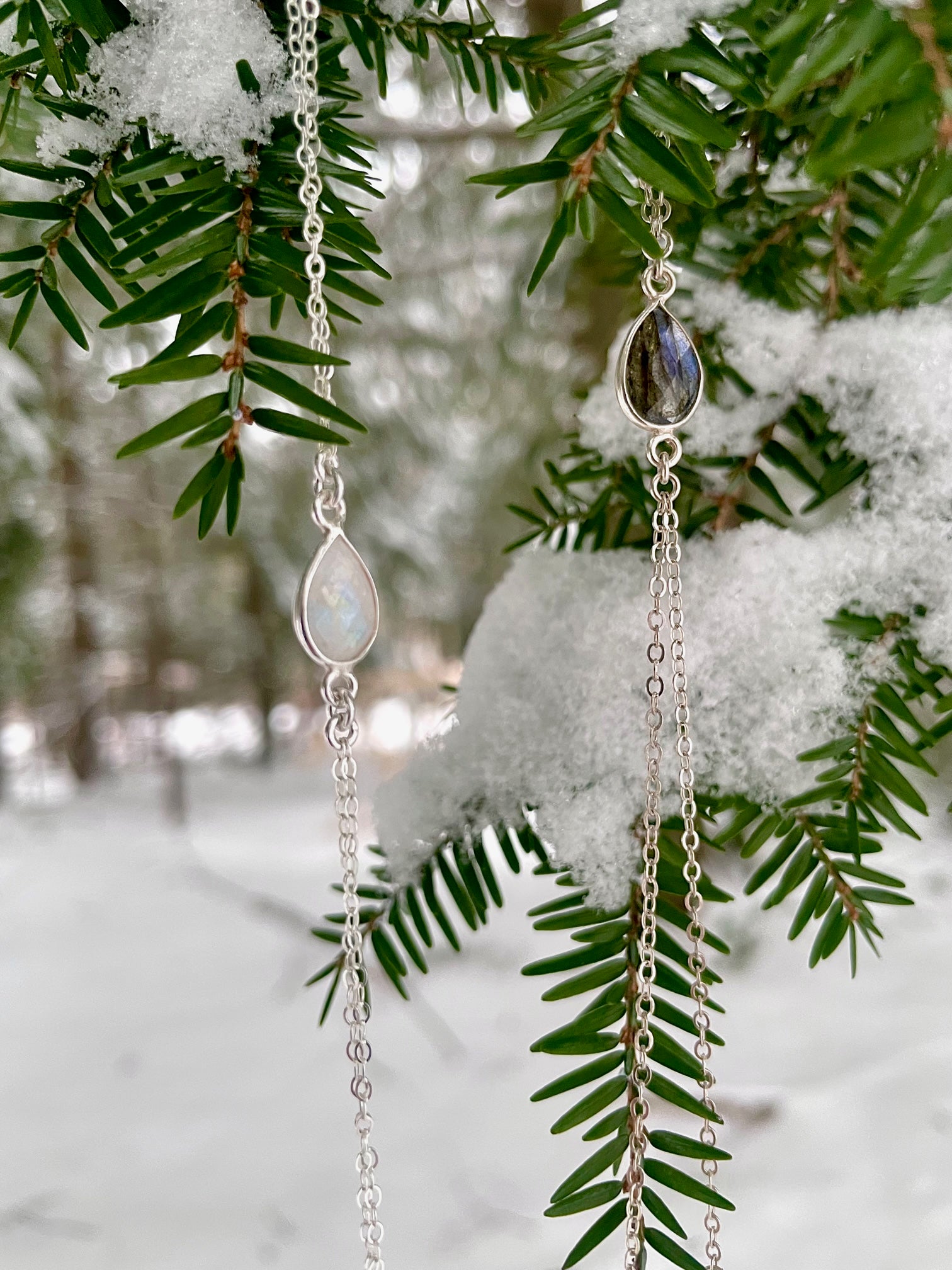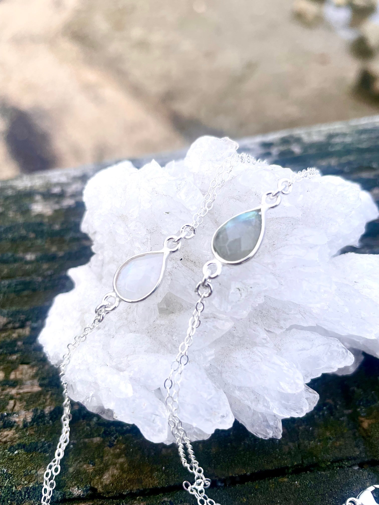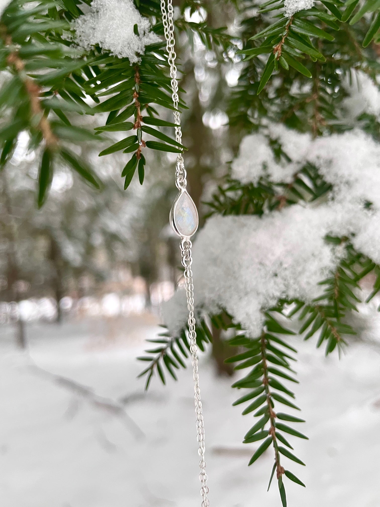 Moonstone faceted teardrop gemstone in a sterling silver setting, sterling silver chain and findings, finished with an engraved jewelry tag. Perfect for a classy touch to your every day life or a special occasion!