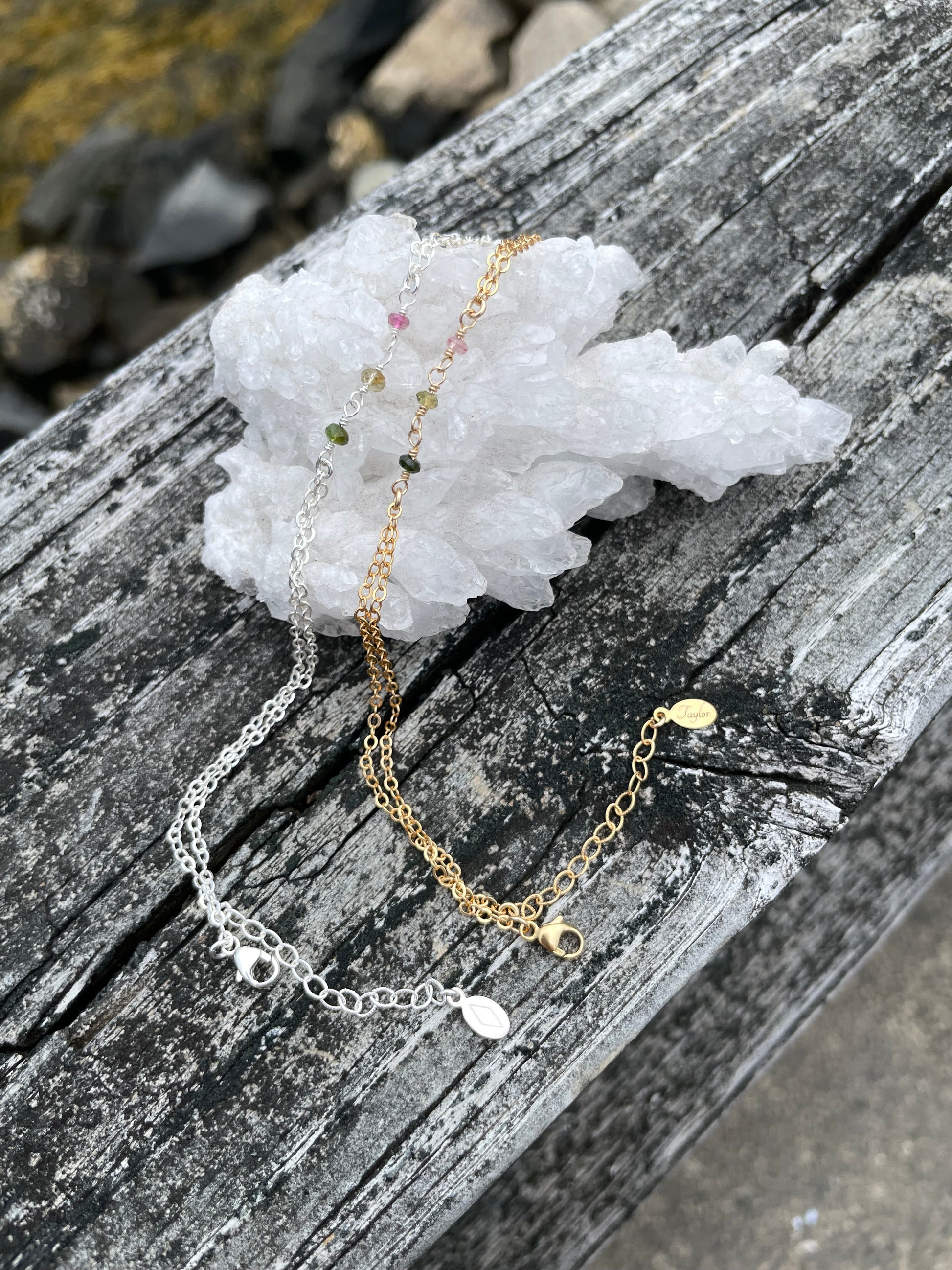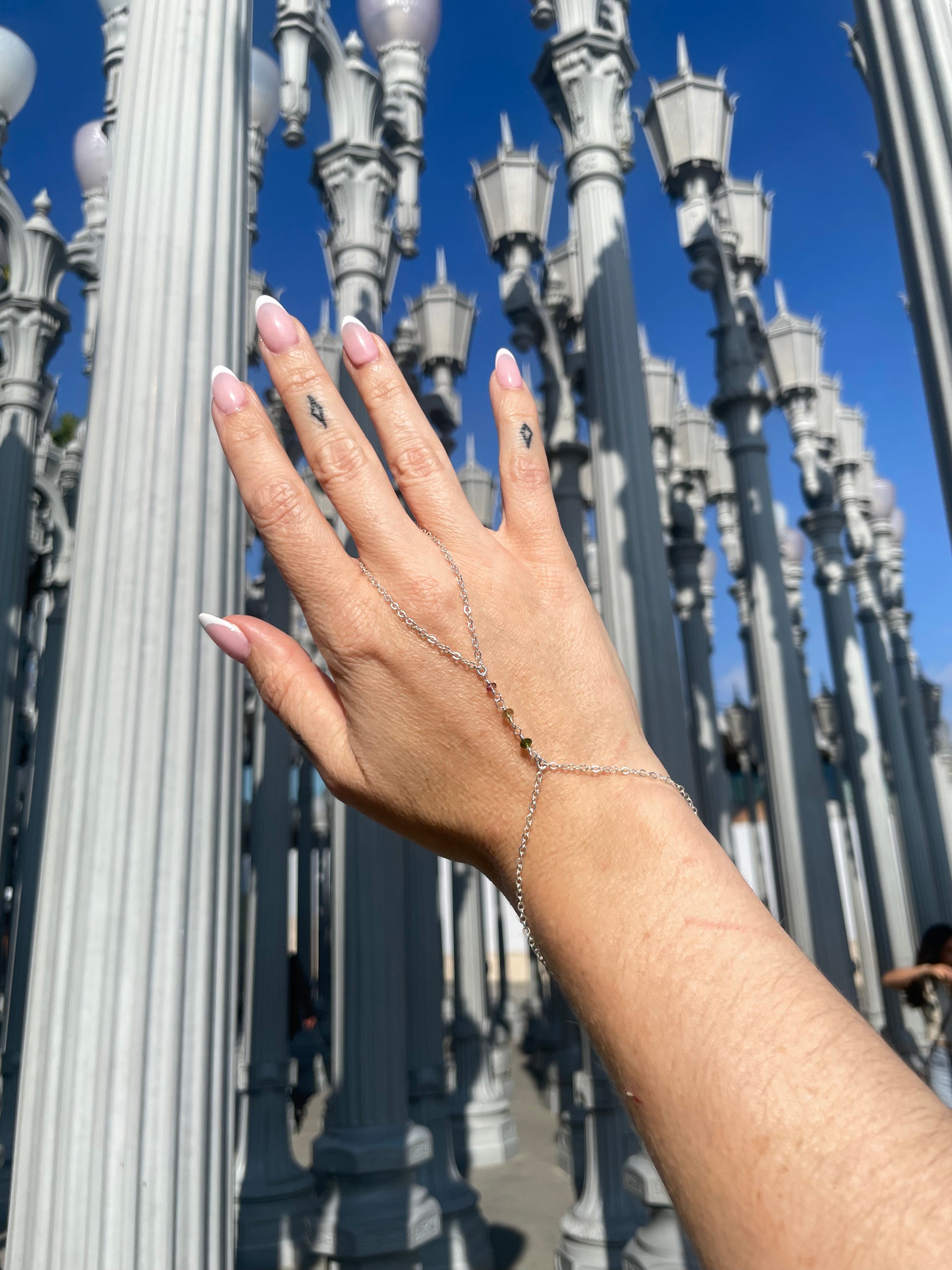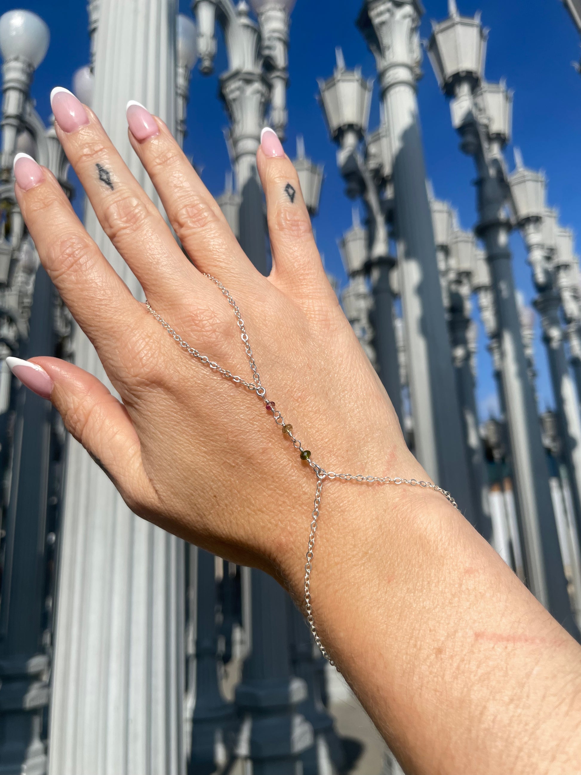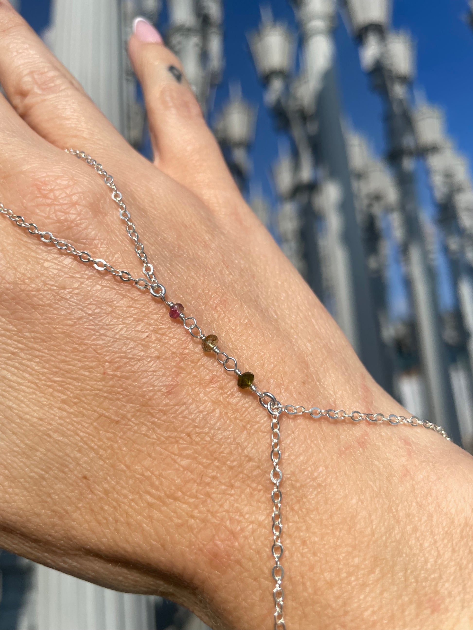 Tourmaline Wrapped Silver Hand Chain